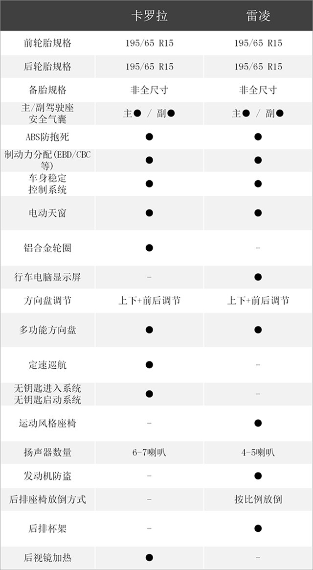 配置方面来说,1.2T最低配版本卡罗拉比雷凌多了后视镜加热、铝合金轮圈、无钥匙进入和无钥匙启动,而雷凌则是多了运动座椅、发动机电子防盗这些配置。由此可见卡罗拉会更加注重实用性的配置。