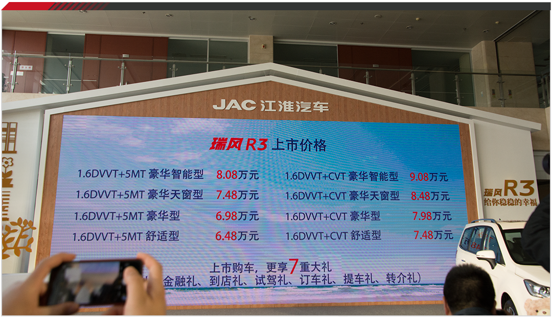 前段时间,江淮汽车公布了旗下一款全新家用MPV的预售价,瑞风R3预售6.48-8.08万。从预售价格上看,相比售价7万起的同级别MPV,瑞风R3就连预售价都是相当之有诚意。