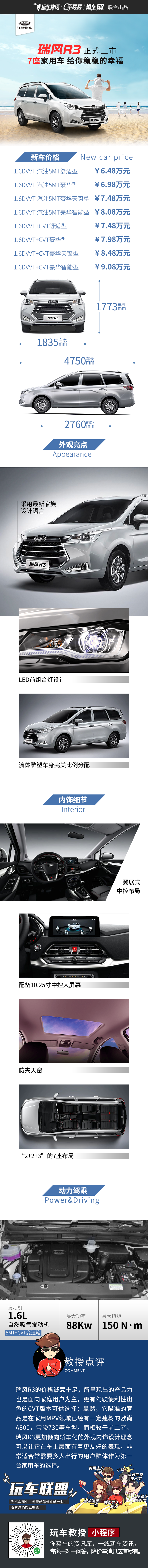 “4月16日,江淮瑞风R3正式上市,售6.48-9.08万元。新车外观采用了家族式的前脸设计,长宽高分别为4750/1835/1773mm,轴距为2760mm,配备了10.25寸悬浮式的中控屏、多功能方向盘、电动折叠后视镜等,标配ESP车身稳定系统、前后驻车雷达、胎压监测ABS、刹车辅助系统、牵引力控制系统等安全配置,搭载一台1.6L自然吸气发动机。”