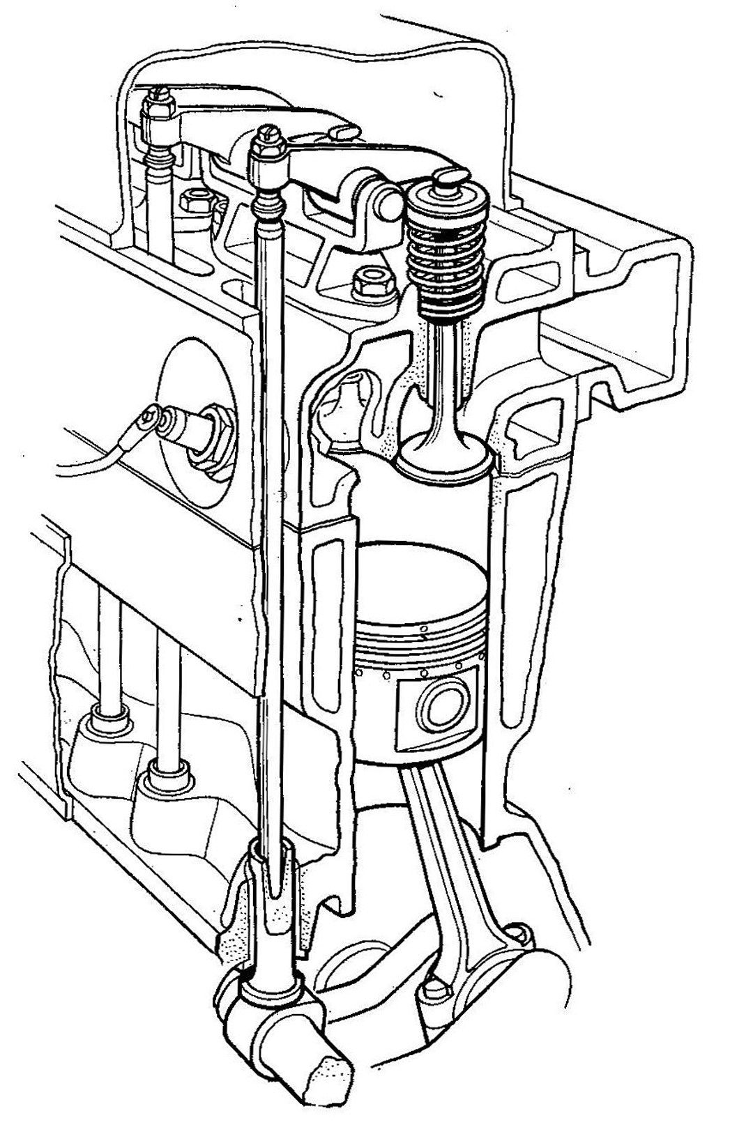 另外一种结构是OHV(底置凸轮轴)结构,使用底置凸轮轴的发动机,一般是大排量,低转速,追求大扭矩输出的发动机,因为底置凸轮轴是依靠曲轴带动,凸轮和气门摇臂使用一根金属杆连接,凸轮顶动连杆,连杆带动摇臂来实现气门的开合,转速过高可能会使连杆压力过大而折断,所以如今的OHV结构的发动机都使用高强度钢或钛合金来制造挺杆。