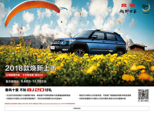 2千元踏春油补:凡购买2018款北京(BJ)20任意车型的客户,可在交车时获赠2000元加油卡;