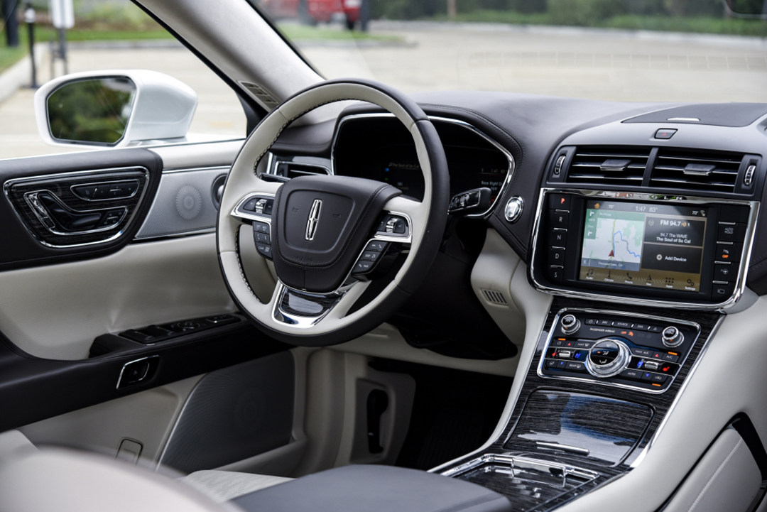 林肯大陆的最大吸引力体现在内饰中,中控台设计并没有非常独特的设计语言但是用料非常给力,有着大面积的皮革包裹,大尺寸方向盘和宽大的中央扶手都是典型的美式豪华风格;但最引人注意的还是前排的两张40向调节真皮座椅,不仅能够对身体各部分提供非常到位的支撑,坐垫材质更有如高档沙发般柔软舒适,再加上同样宽大、柔软的后排座椅以及后排“U”型头枕,林肯大陆的内饰舒适性在这个价位几乎无车能敌。