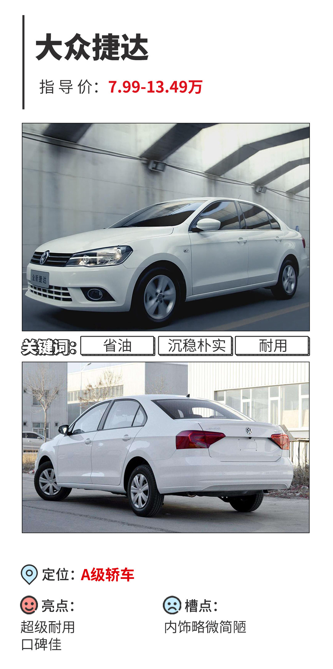当你褪去世间的浮华,只注重朴素纯粹的实用时,毫无疑问,捷达就是一台好车!坊间有传“开不坏的捷达”,时至今日我们还能再路上看见06款的捷达王,稍加留意甚至你还会偶遇到02款的!而在驾校不少人也领略到它的风采,而新捷达更加有颜!