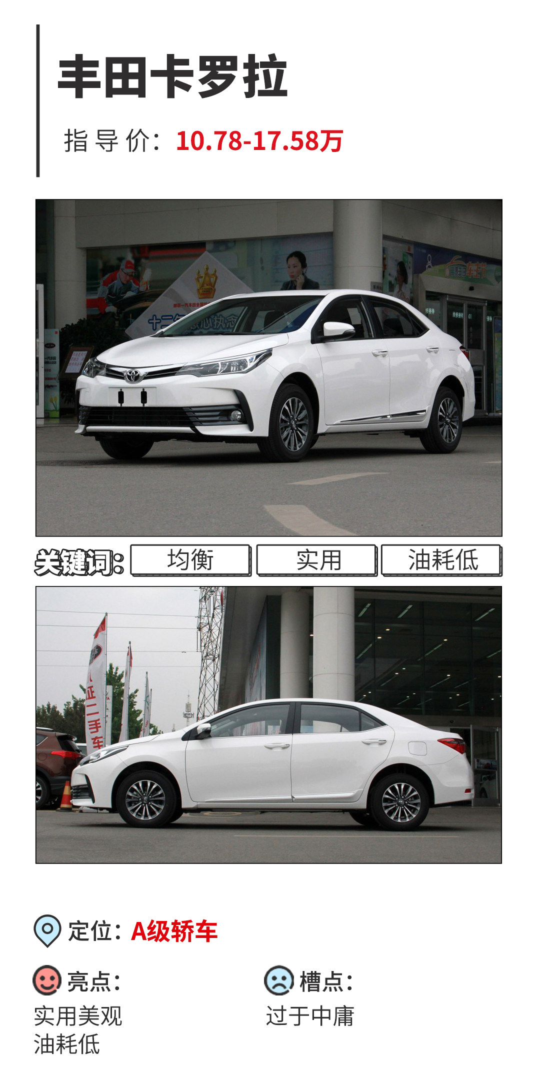 卡罗拉给车迷最深刻的印象恐怕是藤原豆腐店的那台AE86,但其实卡罗拉是一部彻头彻尾的正宗买菜车,它最擅长的是恰到好处的均衡。继承了丰田质量,全球4000万用户的选择!中庸之道似乎就是它最大的追求,始终贯彻质量至上且物美价廉的卡罗拉谁不喜欢呢?