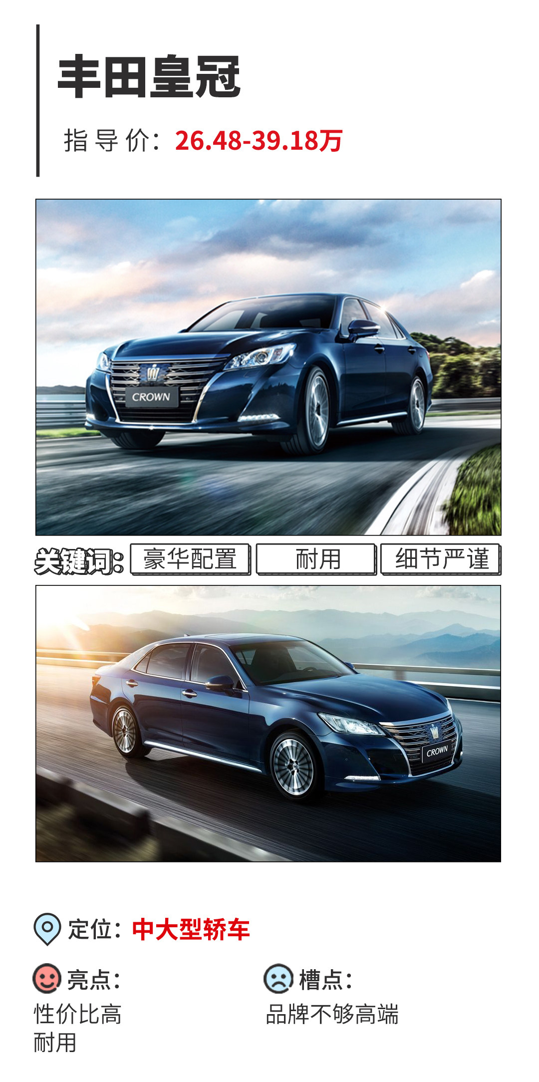 假若您是享有一定地位的生意人,皇冠无疑是你最好的选择!虽有很多车都有它的配置,但要做到真正的高贵豪华且细节细腻程度堪比百万豪车,同价位就真的仅此一家,更让人惊讶的是这种严谨的细节在质量上同样体现!你可以随便在二手市场找一辆旧皇冠即便是05年的第一代国产版,你会发现车上每一个按钮都还能正常使用,这犹如“乐声”电视随便一用便是几十年的事,甚至用到你嫌弃它老旧把它换掉的那天它还十年如一日地如常工作;
