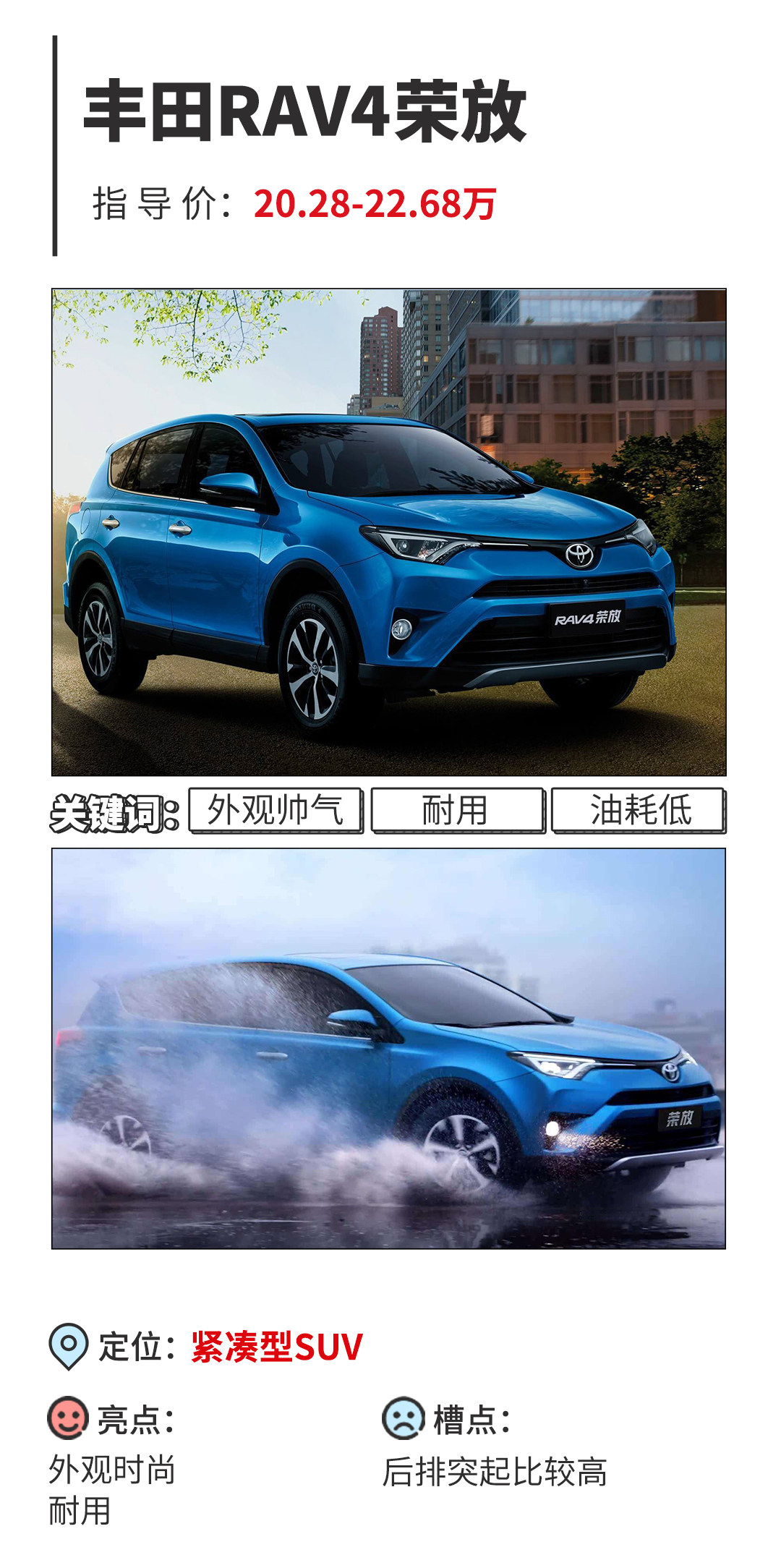 需要一辆可以带家人偶尔郊游的SUV,在假日带来充满笑声的美好回忆那不妨考虑一下荣放,“RAV4”这个名号一直是代表丰田最可靠质量之一,要知道丰田是能造出“Hilux”这等近乎不死的怪物的厂家,能在丰田里混个出名那可都并非等闲之辈;