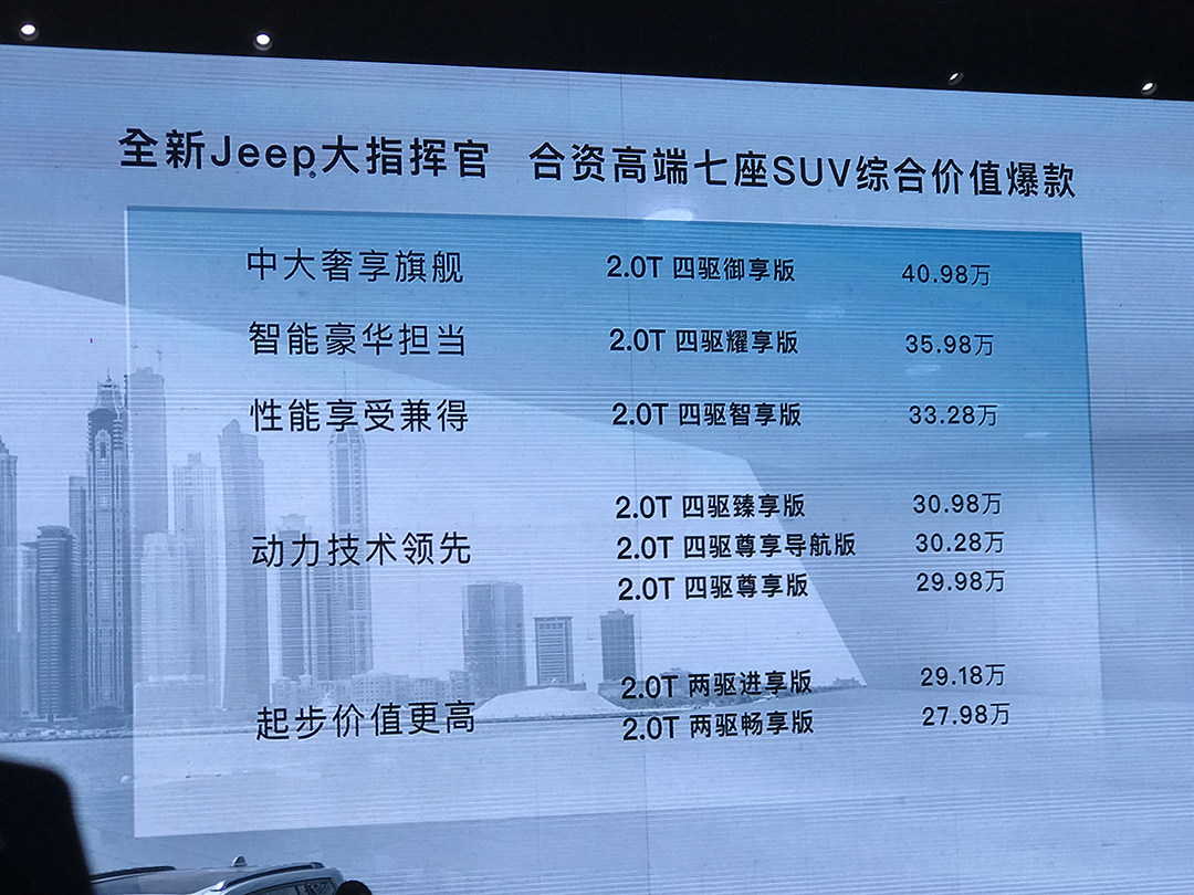 Jeep推出全新SUV大指挥官,共8款车型,售价为27.98万——40.98万。新车最大的卖点为大7座SUV,配备四驱系统,上市后将直接面对锐界以及汉兰达等合资竞品。