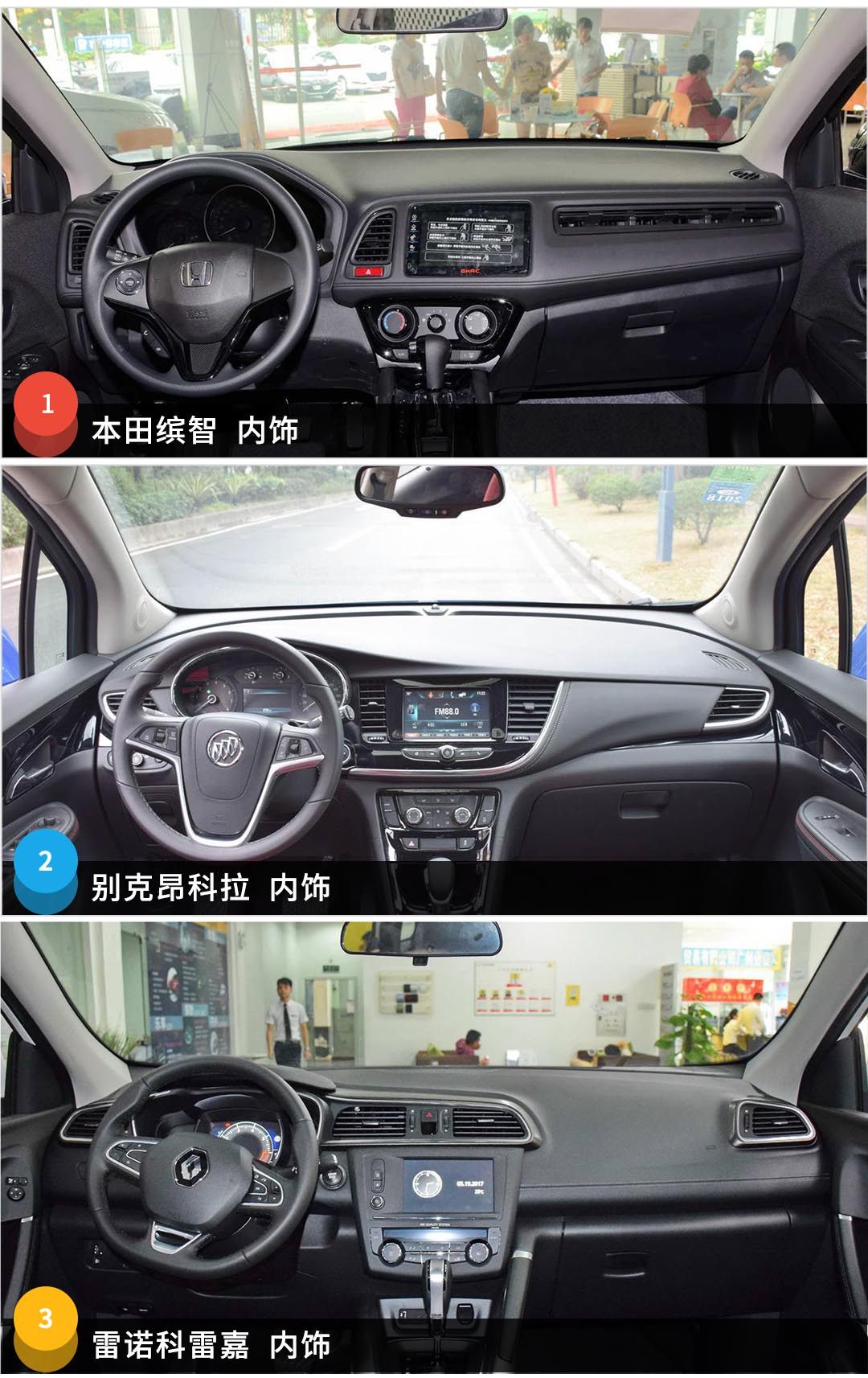 然后就是它们的内饰了,在这方面,缤智的中控平台是比较偏向驾驶员的,这会给驾驶员带来一定的便利;而昂科拉的内饰则是比较偏向于做工方面,比较精致;而科雷嘉则是法国的浪漫气息设计;可以说三款车都在这个级别的设计水准上了。