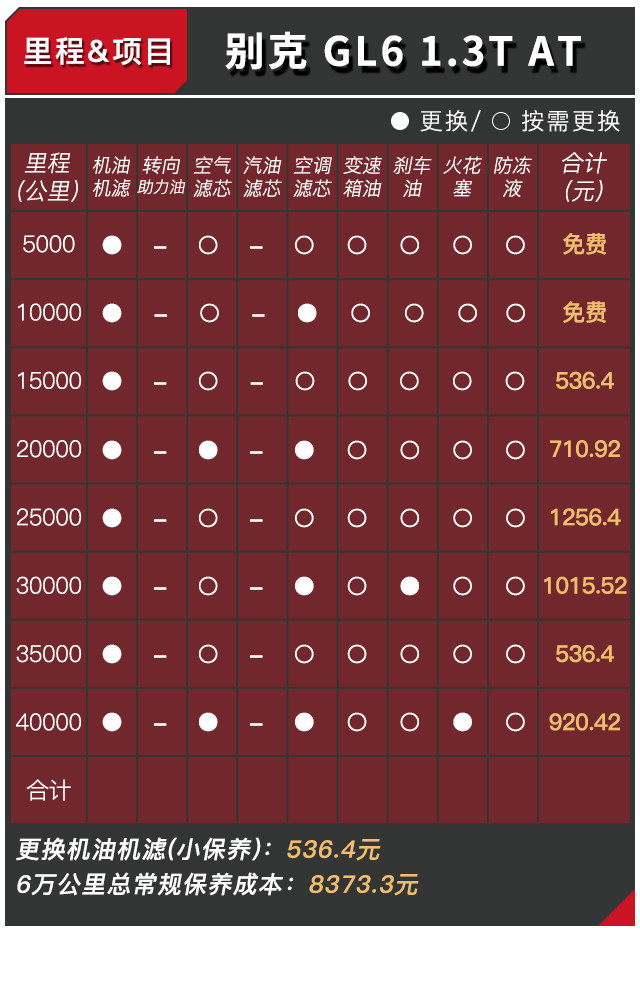 就上述的数据来看,GL6的保养周期比较短,一般0.5万公里或6个月后就需要保养一次,常规的保养费用为8375.3元,每月花费1556元左右,整体花费还是有点偏高,成本高也主要表现在后期保养费的支出。