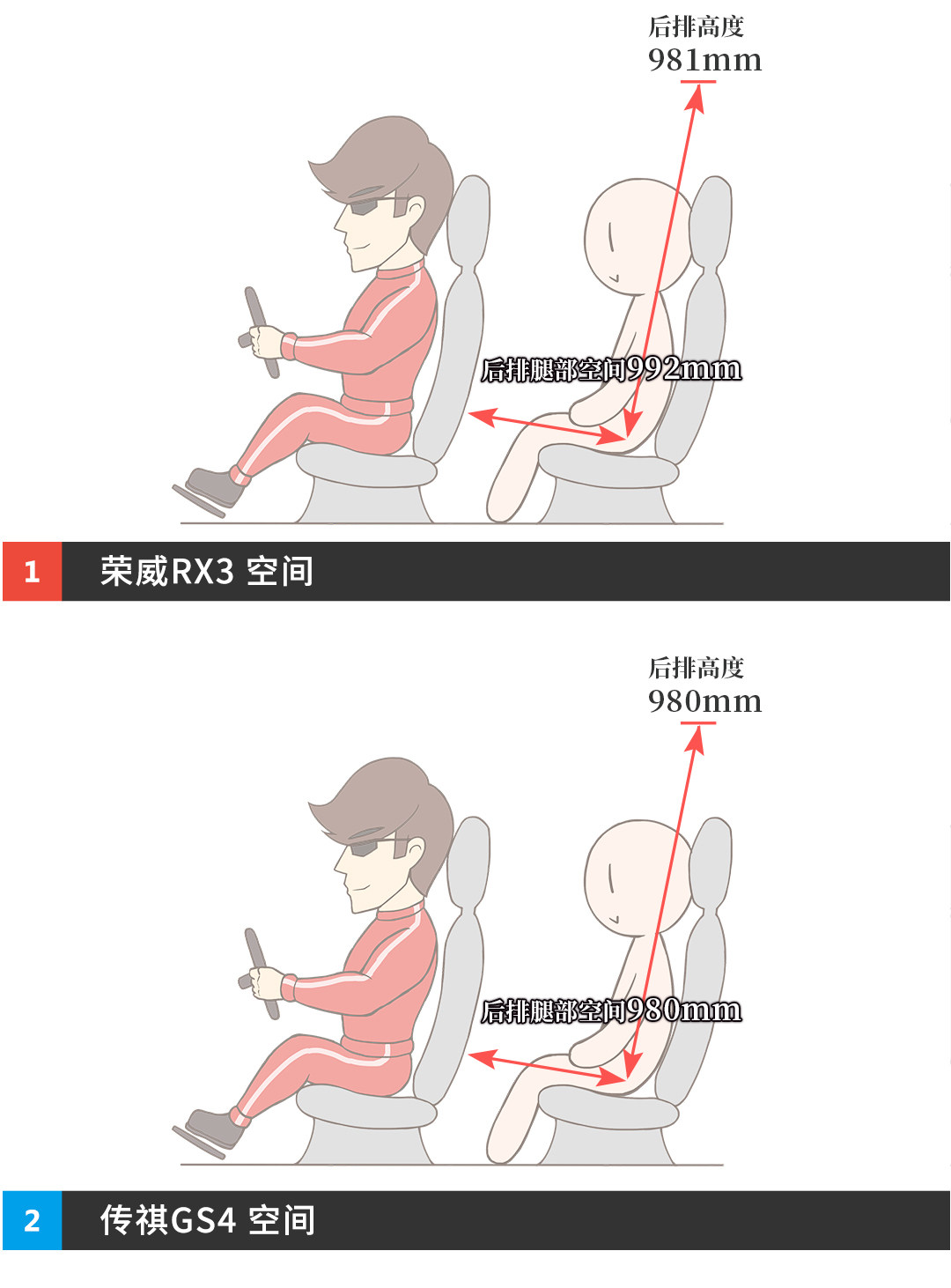 但凭借着极高的空间利用率,在实际乘坐空间的上,无论是后排头部空间还是腿部空间,荣威RX3的表现均要优于传祺GS4,而且有消息称新款GS4轴距将缩短,车身高度发低,这可能后排空间会更为局促,届时RX3的后排空间优势会更明显。