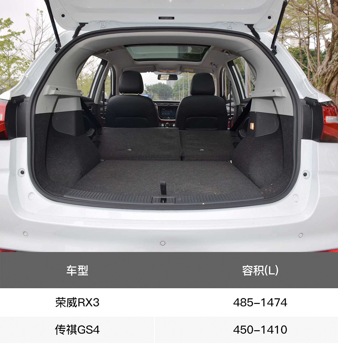 而值得一提的是,荣威RX3的后备箱容积为485-1474,足足比GS4多出64L,也是同级别当中后备箱容积最大的车型。