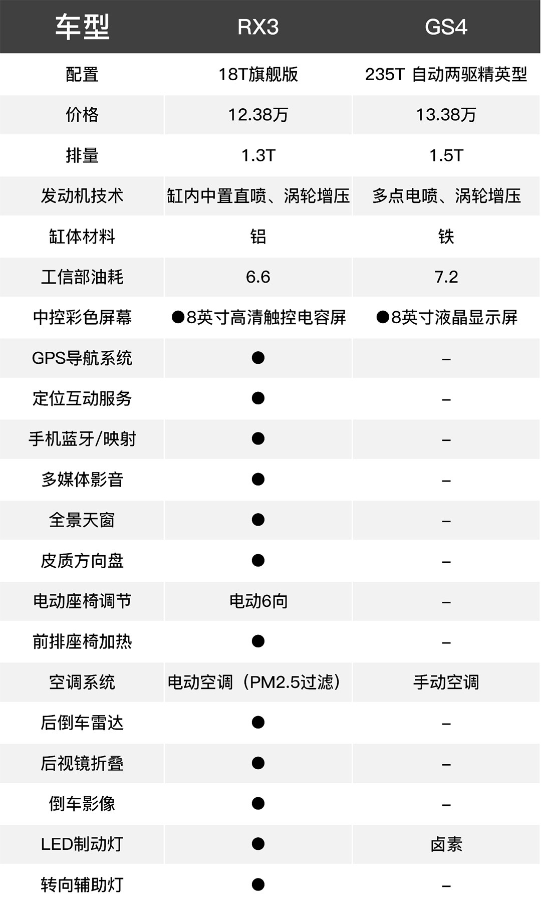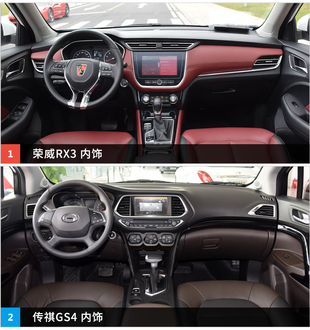 拿出两款热销的版本作对比,你会发现荣威RX3的配置水平会比传祺GS4更为厚道,像倒车影像、中控高清触控电容屏,手机蓝牙、GPS导航、主驾电动调节、 前排座椅加热、皮质方向盘、后视镜加热、自动空调等都是该版本的GS4所缺失的。