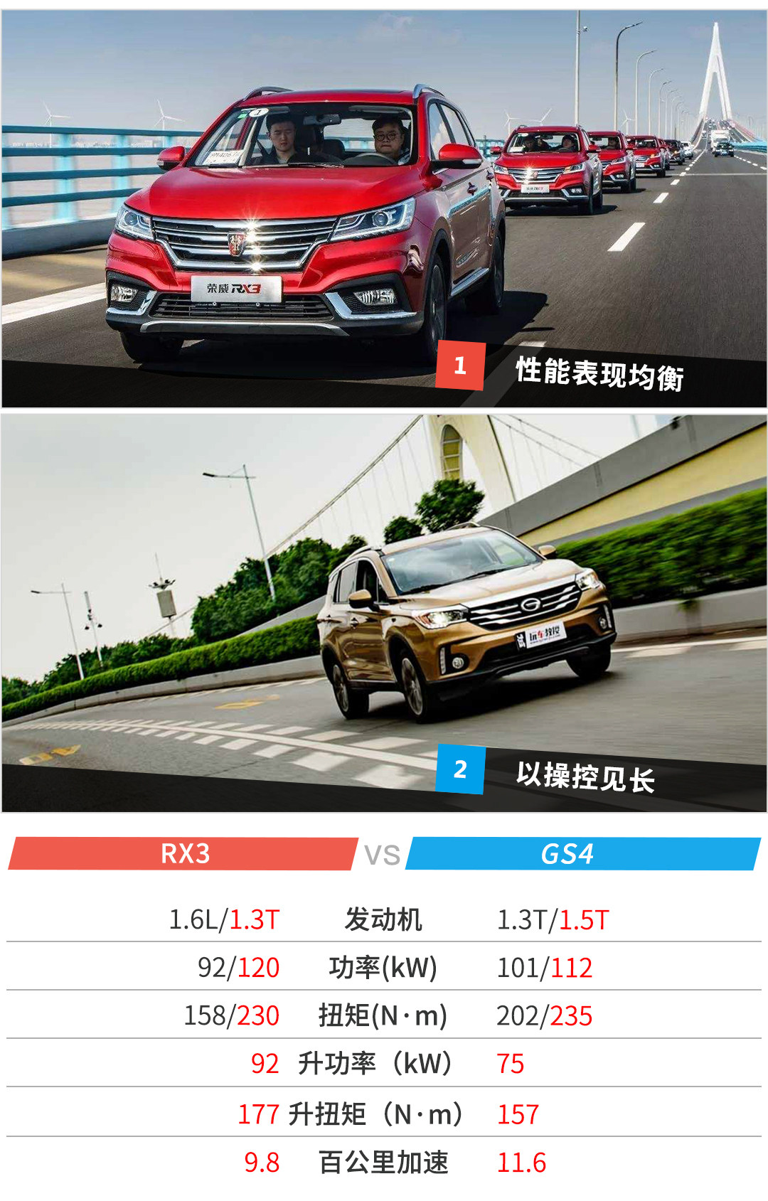 传祺GS4一直以来都是以操控运动的风格为主,但这也造成了在整车舒适性方面欠佳,相比之下荣威RX3的表现却更为均衡。前者配备了同级最常见的1.3T、1.5T两款涡轮增压发动机,而后者则是注重性能动力的1.3T涡轮增压发动机以及注重舒适经济的1.6L自然吸气发动机。两者虽然同样采用了1.3T的动力总成,但在RX3上这台发动机的动力水平甚至于超过GS4的1.5T版本,接近92KW/L的升功率让它成为了同级别唯一百公里加速跑进10秒内的车型。