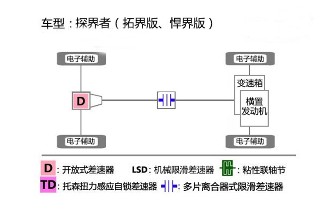 探界者搭载的是1.5T+6AT和2.0T+9AT的动力组成,其中2.0T版本的车型具有较强的动力输出能力,可爆发出260匹的马力,峰值扭矩353牛·米,而且9AT平顺性出色,且时速95km/h就能挂上9挡,燃油经济性也尤为出色。在高配车型上,探界者搭载了动力可以100%断开给前轴的适时四驱系统,采用的是电控多片离合器式限滑差速器作为动力分配。目前探界者搭载了四驱系统的主要有2.0T版本的高配车型和1.5T的自动四驱版车型。