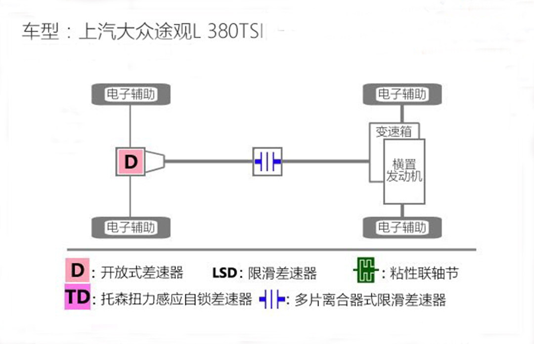 途观L选择了搭载这个等级车型比较受消费者关注的2.0T的发动机,匹配的是7DSG变速器,账面上的动力数据表现很不错,最大的马力是220匹,峰值扭矩350牛·米。和探界者一样,在高配的车型搭载了大众的4MOTION全时四驱系统,用一组电控多片离合器式限滑差速器,来分配轴间动力,轮间则是靠电子限滑来控制,不过因为多片离合器不能完全分离,所以后轴始终可以保持最少5%的动力。