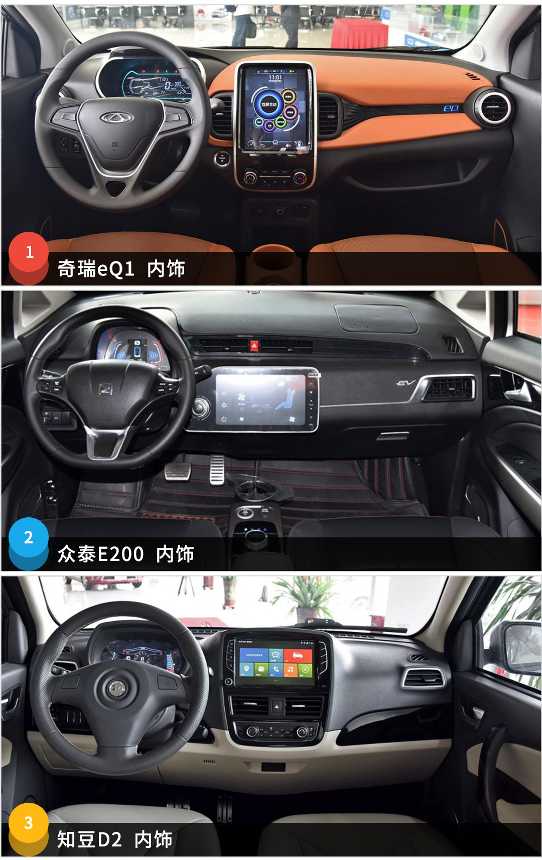 一辆车不仅要有好看的外观,内饰的设计也很重要。麻雀虽小,五脏俱全,活脱脱的一个缩小版的家轿内饰设计,甚至还配备了许多轿车都没有的中控液晶屏幕。三者之中奇瑞eQ1的内饰用料最为出众,显示屏的灵敏度也很好;E200看起来有些廉价,手感也不是很好;知豆则是有些平庸,相对老气一点。