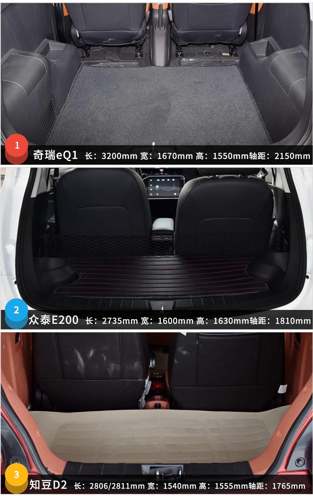 奇瑞eQ1最大,知豆D2最小,毕竟微型车,你不能对它们的空间抱有太大的期待,当然两个人坐里面不会感到憋屈。众泰E200还具有主副驾驶座电动调节的功能,高级感一下子就上来了。主副驾坐人没什么问题,后备箱储物又是怎么样呢,我们来一起看看。对比图片就可以看出,奇瑞eQ1的开口及进深最大,知豆D2的开口很小,当然储物能力相较于其他两个弱势比较明显。虽然它们车身小,但是还是可以装东西的,只不过大件就不要想了。教授亲测过奇瑞eQ1的储物能力,放一个24寸的行李箱加一张被子再加一些杂七杂八的小物件完全没有问题。其他两车放个24寸的行李箱估计都够呛,所以在装载能力上这些微型车确实是个短板。