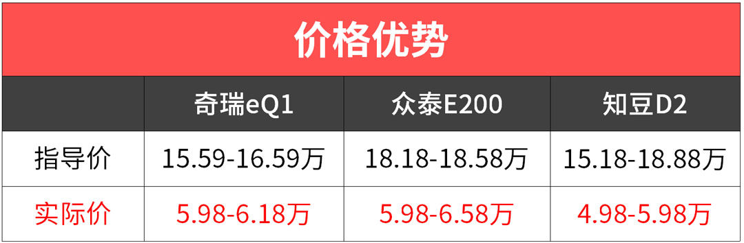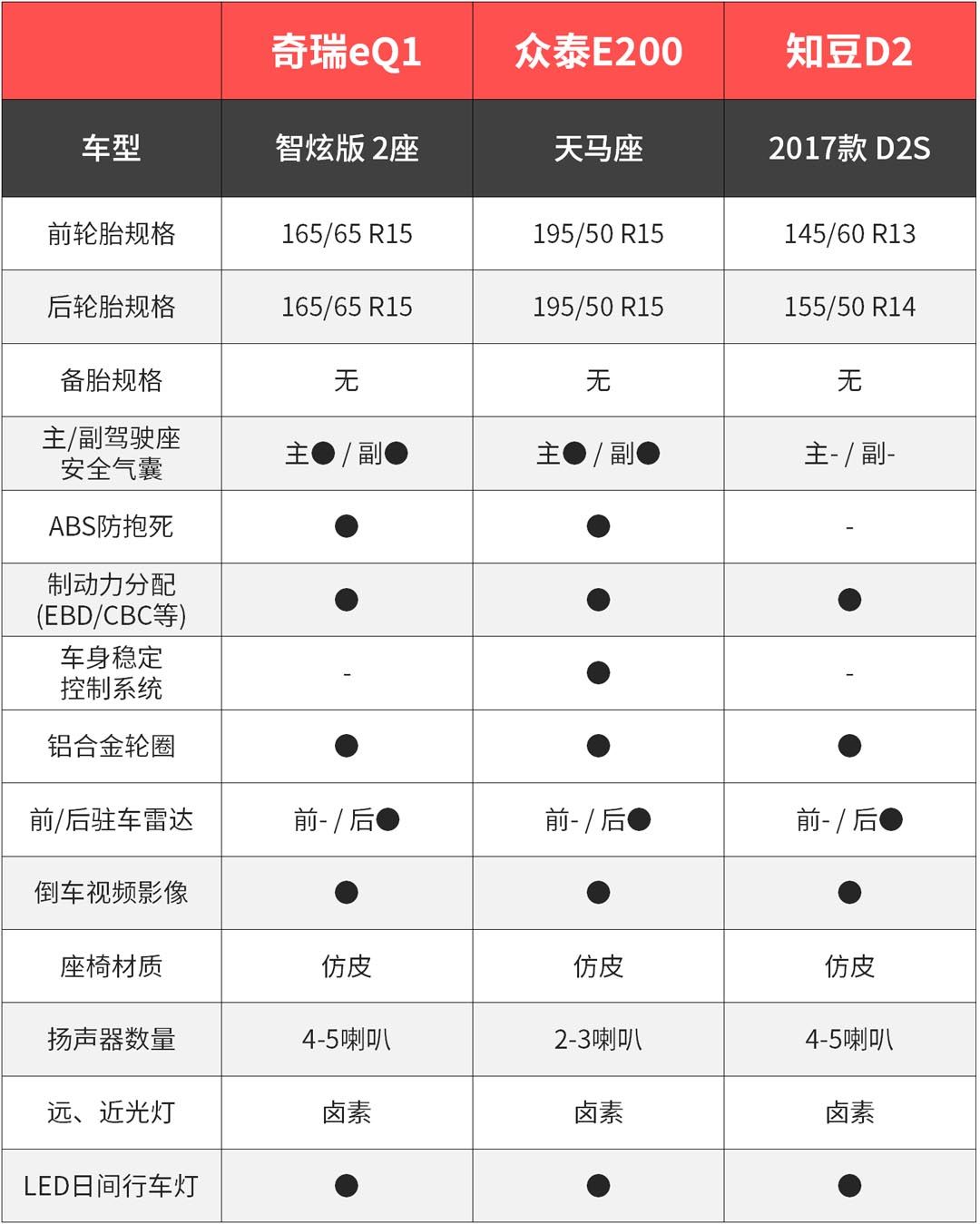 对比三车,众泰E200做的还是比较好的,除了主副驾驶座都有安全气囊外,还配备了车身稳定系统(科技版没有)、ABS防抱死,相对来说众泰E200要安全一些。再来看看奇瑞eQ1,虽然没有车身稳定系统,但是起码有安全气囊跟ABS防抱死系统。知豆D2的配置可谓是相当简陋,连最基本的气囊都没有,虽说开这电动车一般都不会开太快,但是没有安全气囊的保护,生命安全没有保障。