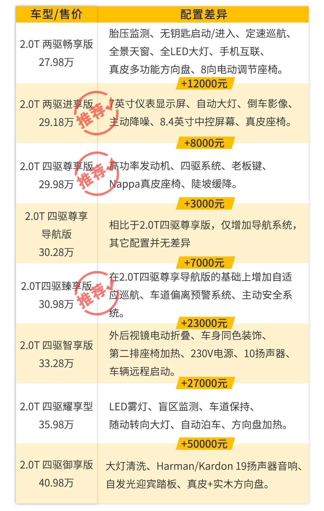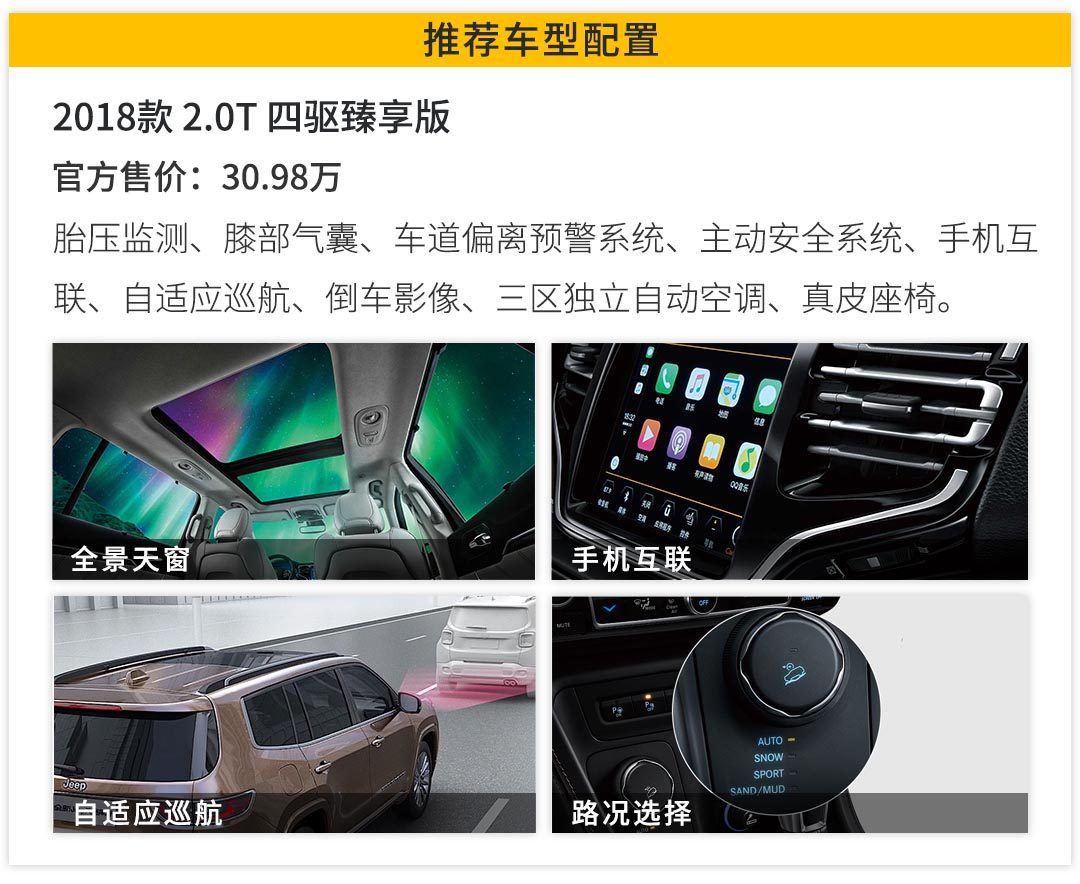 大指挥官共8个配置可选,其中指导价为27.98万的畅享版配置虽能满足基本使用需求,但是定价稍高,性价比不突出,假如对四驱没有需求的话两驱进享版也是不错的选择,加多1.2万元就增加了更大尺寸的中控屏,增加了电动尾门,倒车影像,真皮座椅等,档次感更高。性价比最高车型为2.0T 四驱臻享版,不仅各种舒适性配置齐全,并且还具备诸如车道偏离预警,自适应巡航系统等科技驾驶辅助配置,最重要的是买一台Jeep最好上四驱啦,假如预算比较充足的话这个版本是最值得购买的。