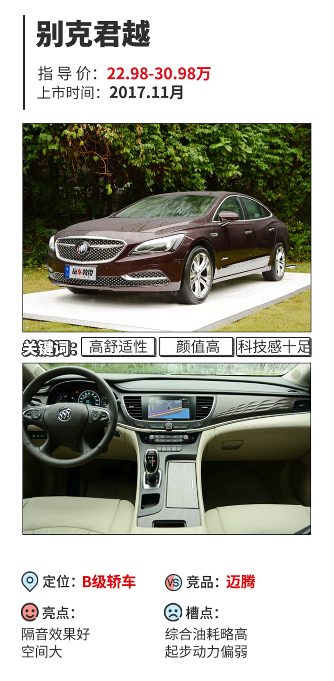 君越和君威虽为孪生兄弟,但是主打方向却不同,君越主打舒适。讲到君越就不得不提一下去年上市的君越Avenir,豪华的内饰设计和充沛动力以及丰富的配置,让消费者有了更佳的驾乘体验。超5米的车身长度给人的感觉相当的大气,2905mm的轴距带来了更大的空间,再配以全景天窗,乘坐环境有了进一步的提升,感觉非常不错。而君越出色的底盘调校技术能很好的过滤掉路面传来的剧烈振动,确保乘坐的舒适性。