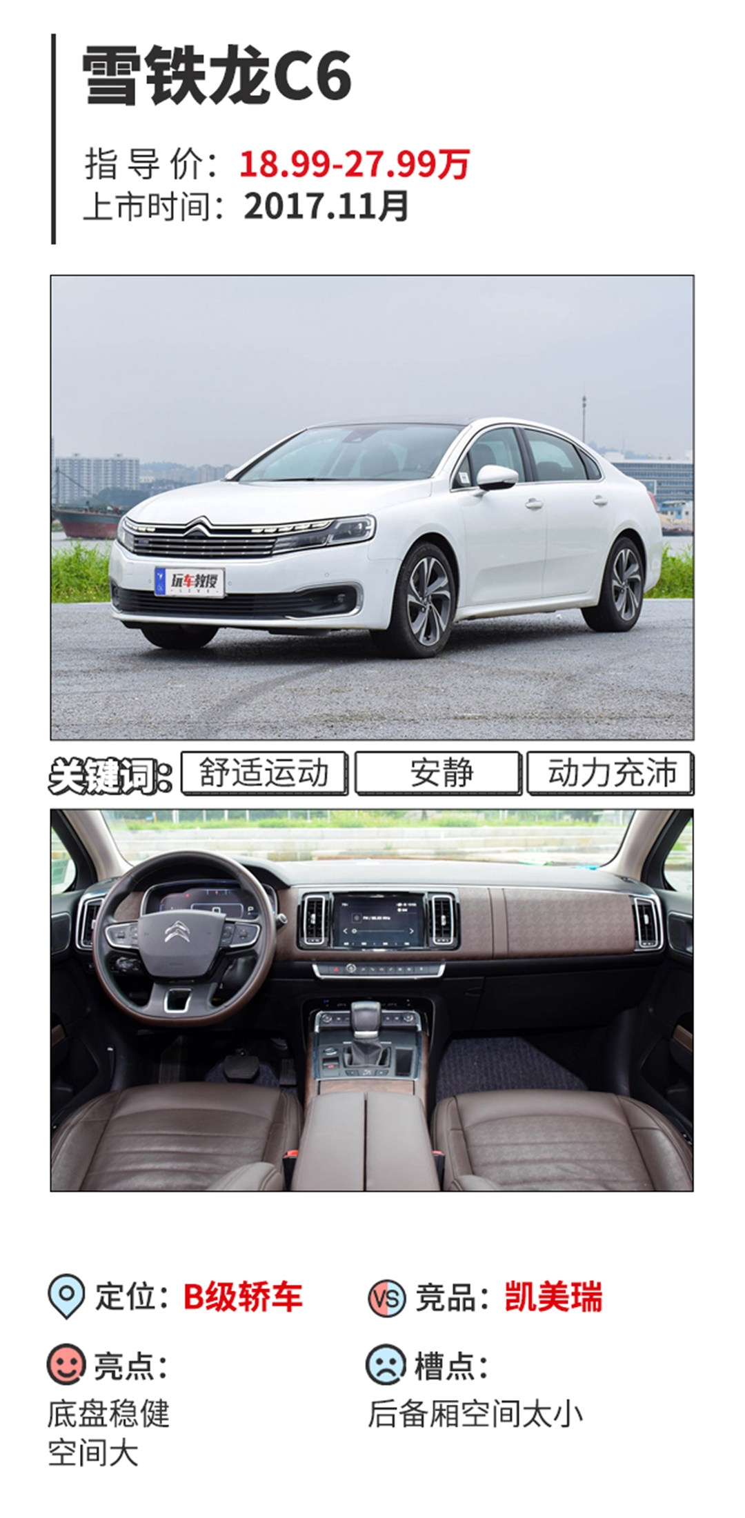 要说哪个牌子在内饰上花的心思最多,法系两个品牌必然当仁不让。雪铁龙C6作为目前雪铁龙旗下最为高端的轿车产品,在乘坐的舒适度、质感上必然也要更出色,C6的内饰虽然看起来很简约,但全真皮式的用料给人非常不错的触感和高级感。2900mm的轴距确保了C6宽敞的乘坐空间。不过在配置方面,此款车的表现就有所欠缺,不说别的就说卤素的前大灯,在这个级别的车里实在是显得太过于廉价,说好的高级感都没了。
