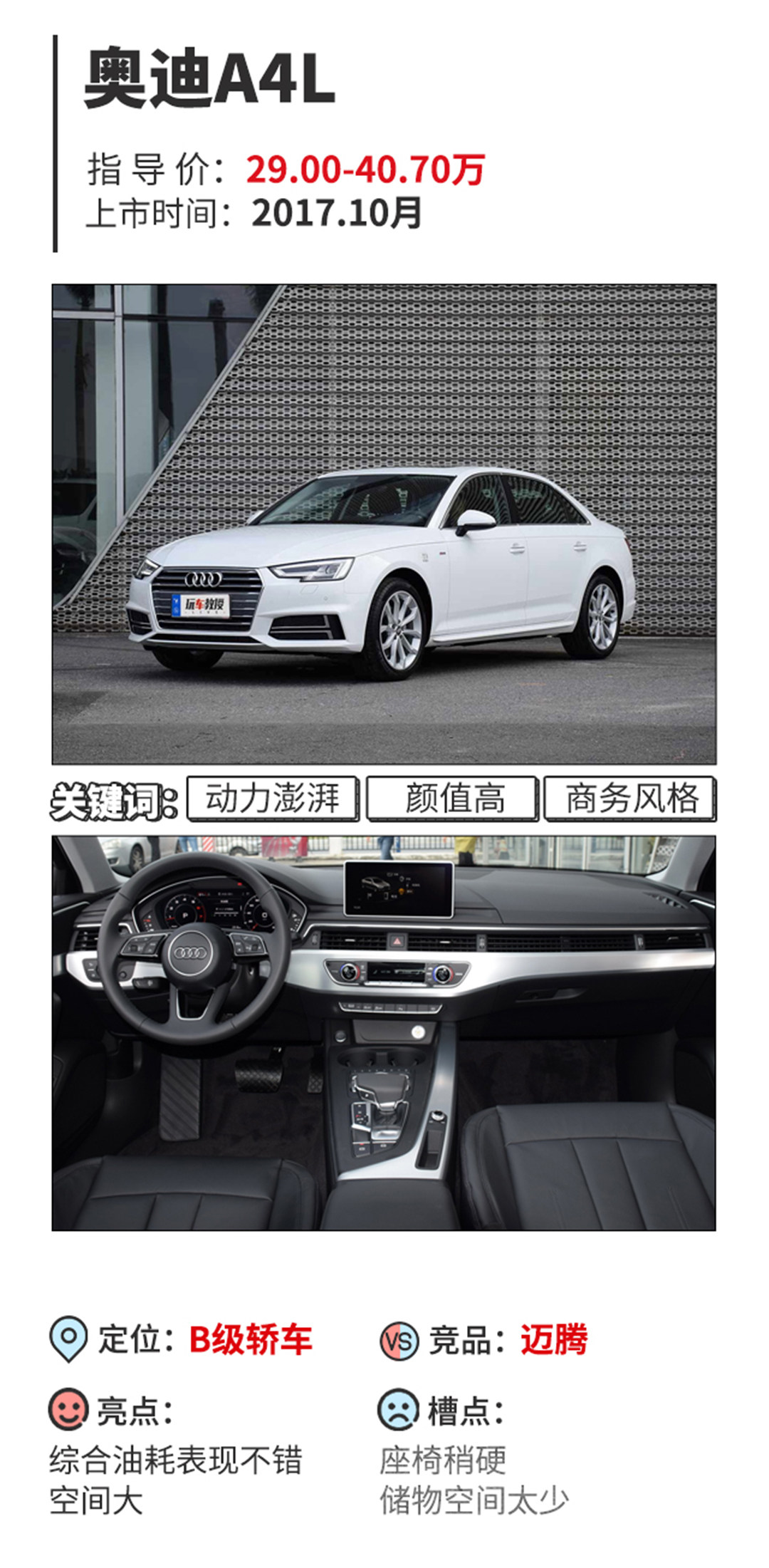 教授辣评:奥迪作豪华舒适品牌的代言人,在车界那是久负盛名。全新款的奥迪A4L车身看起来不仅更加秀气修长,轻量化和性能均衡性程度也更高,2908mm的轴距,令A4L有着超宽敞的乘坐空间。内饰用料有着不错的手感,样式看着也很有档次感,犀利的LED大灯看起来科技感十足,功能性也自然没得说,实在是很符合90后的审美观念。