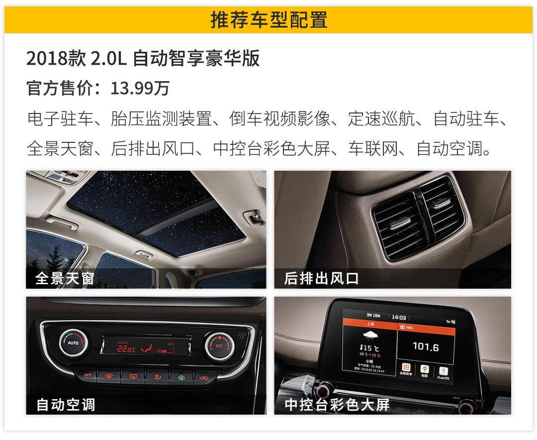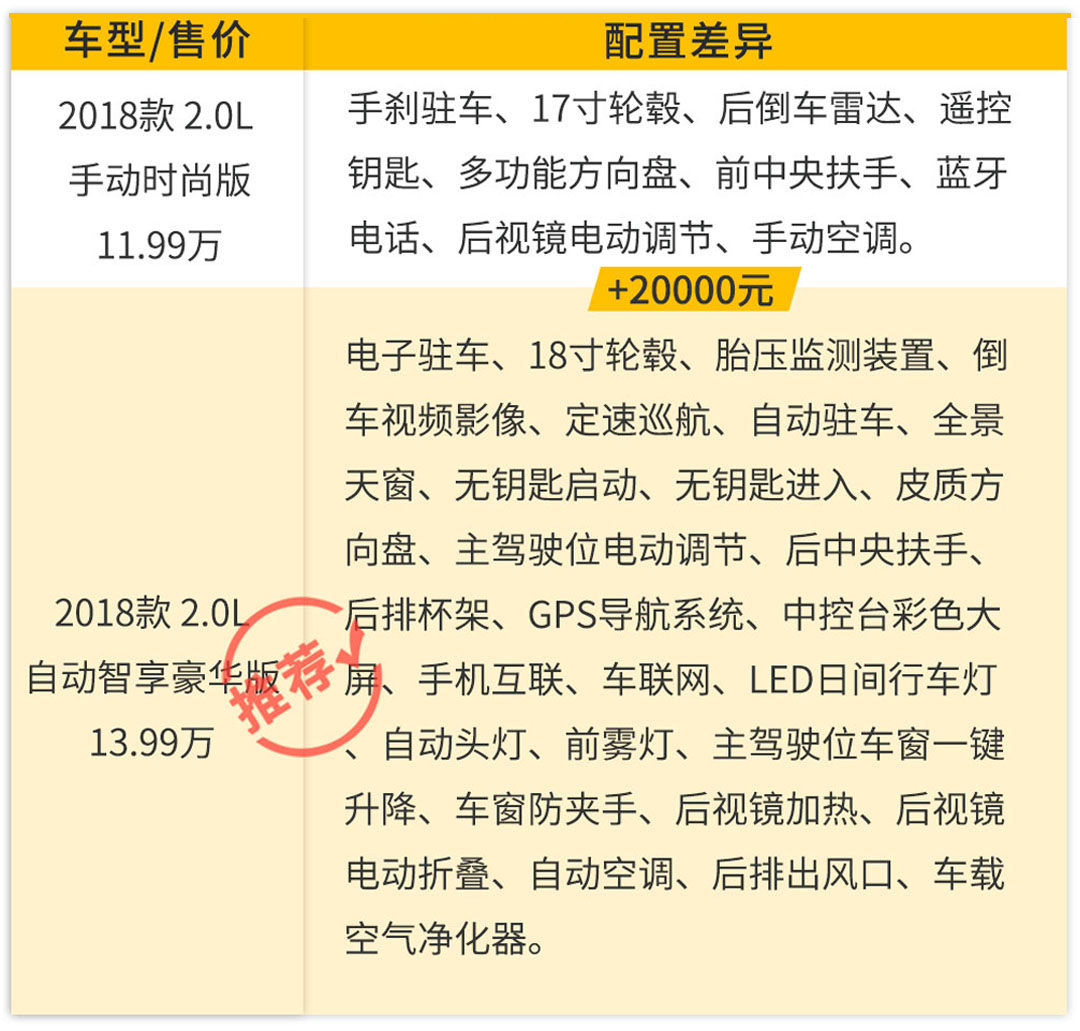 如果你觉得两款车型只是手动挡与自动挡的区别,那你就错了,两款车型相差两万块,除了变速箱不同,其实配置差距非常大,无论是实用性很强的配置,比如倒车视频影像,无钥匙启动、手机互联等、还是时下很受欢迎的配置,如全景天窗、车联网、车载空气净化器等都是自动挡车型才有。我想现在也没有多少人会买手动挡车型吧,自动挡车型这么高的性价比,你真的忍心选择手动挡车型吗?