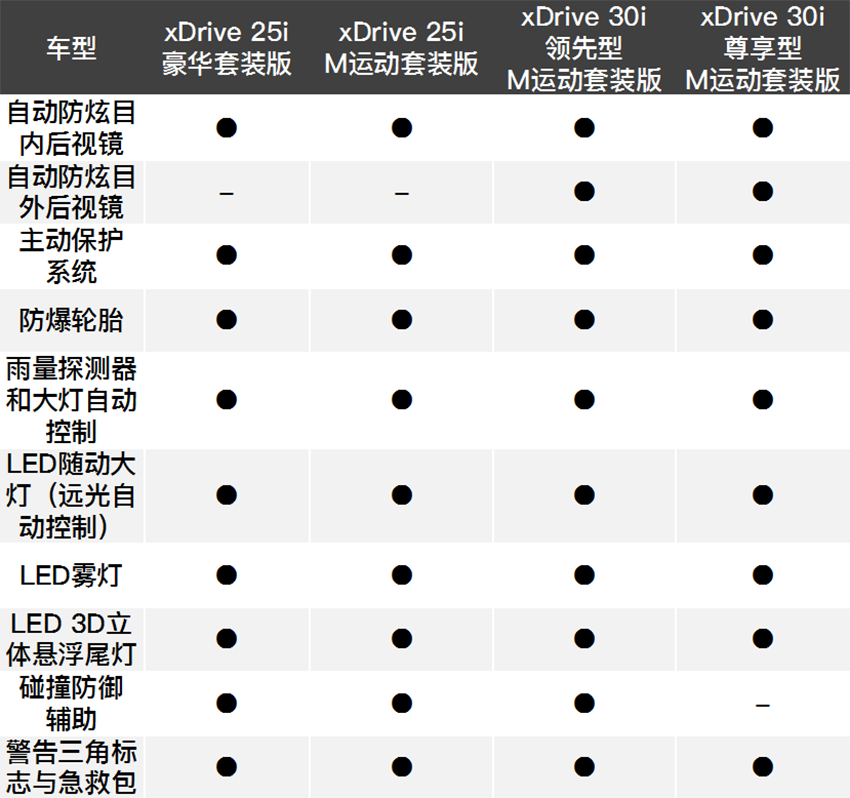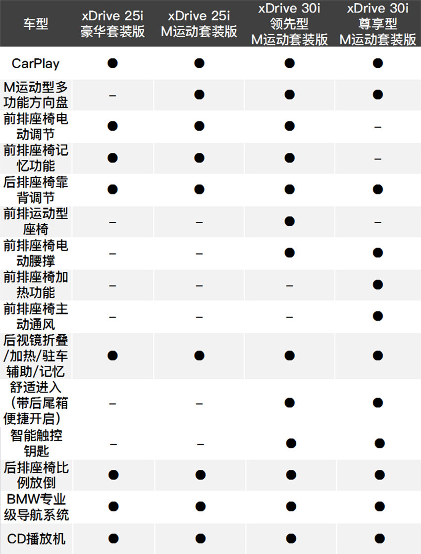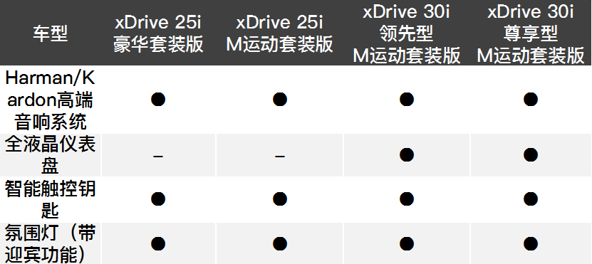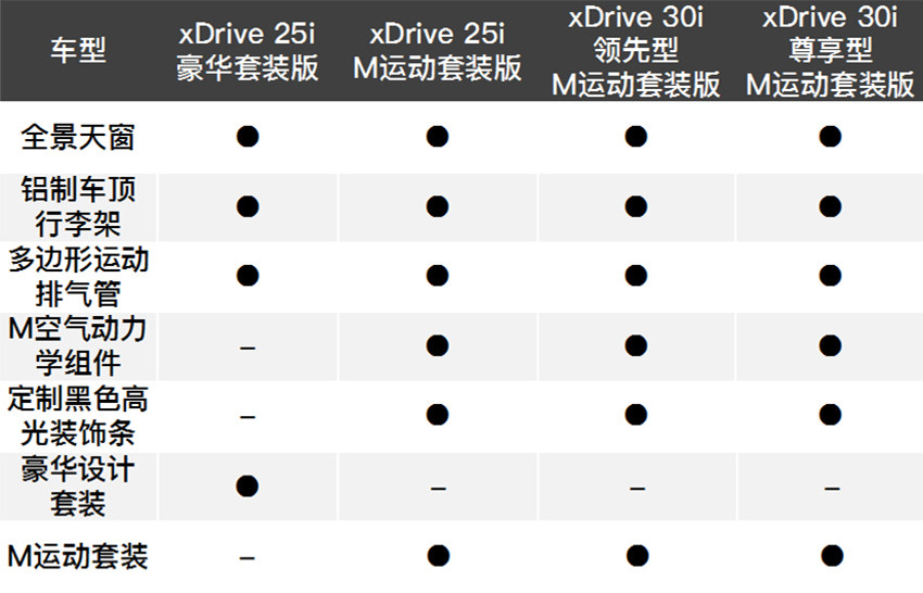 国产后的新车将推出xDrive 25i 豪华套装版、xDrive 25i M运动套装版、xDrive 30i 领先型M运动套装版和xDrive 30i尊享型M运动套装版共四款车型。因此最低配的豪华套装版车型因为没有M空气动力学组件、个性化定制黑色高光装饰条,在外观上将与其它车型就有着明显区别。