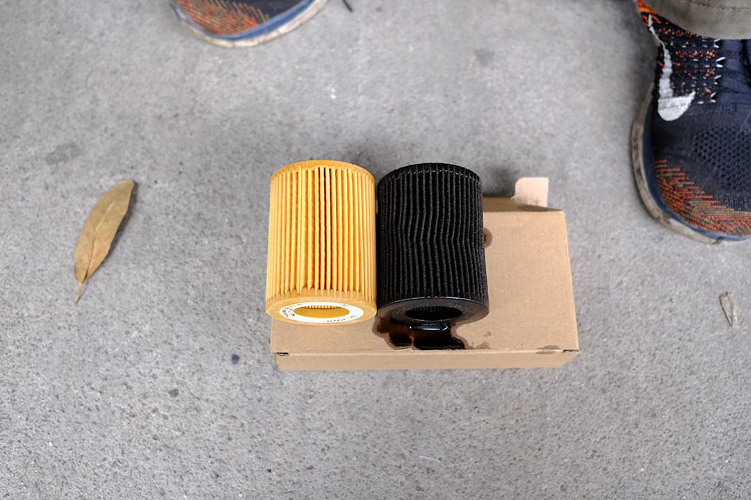 新旧机滤对比,旧的黑的不成样子了,还有一些很小碎屑。