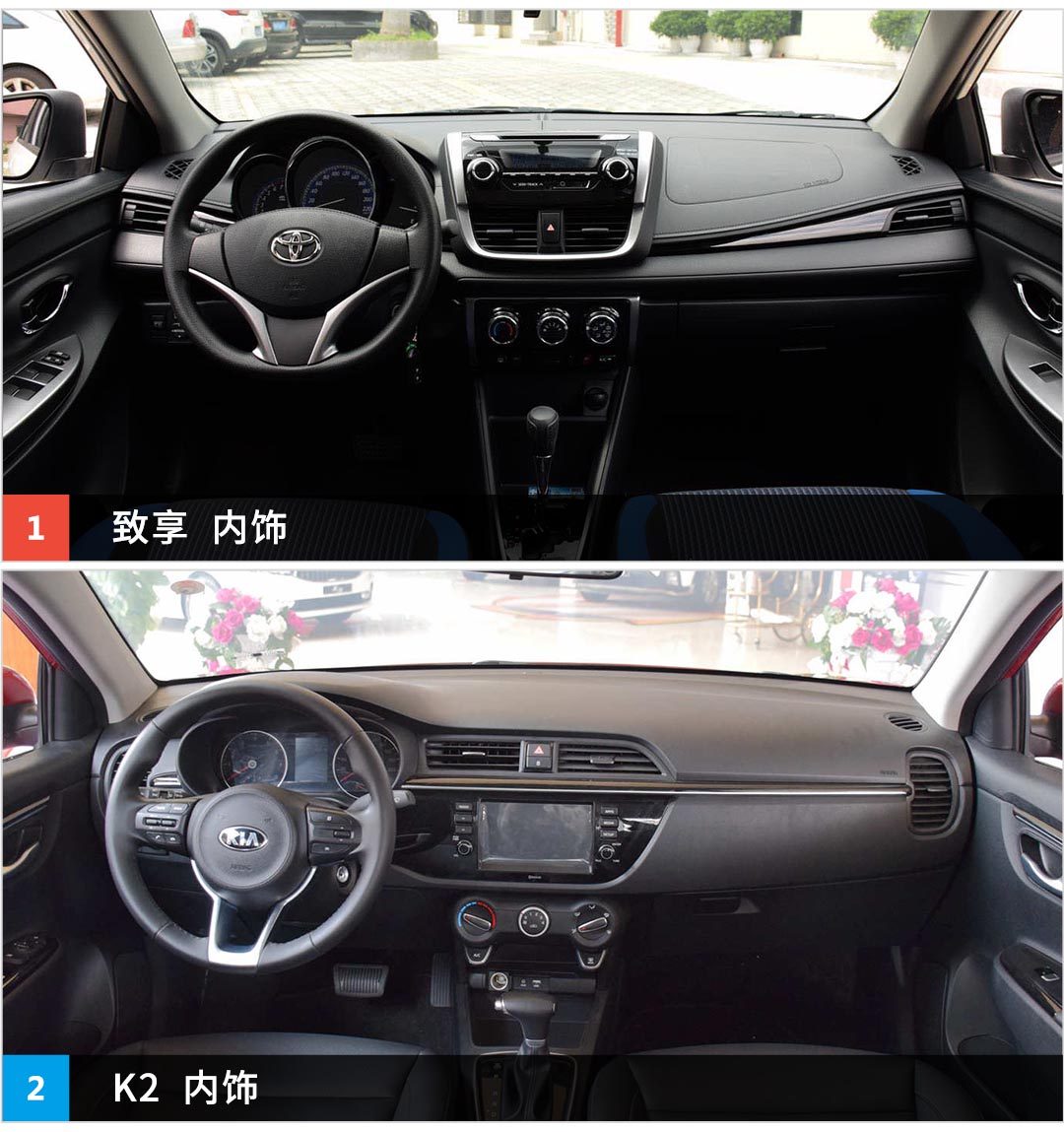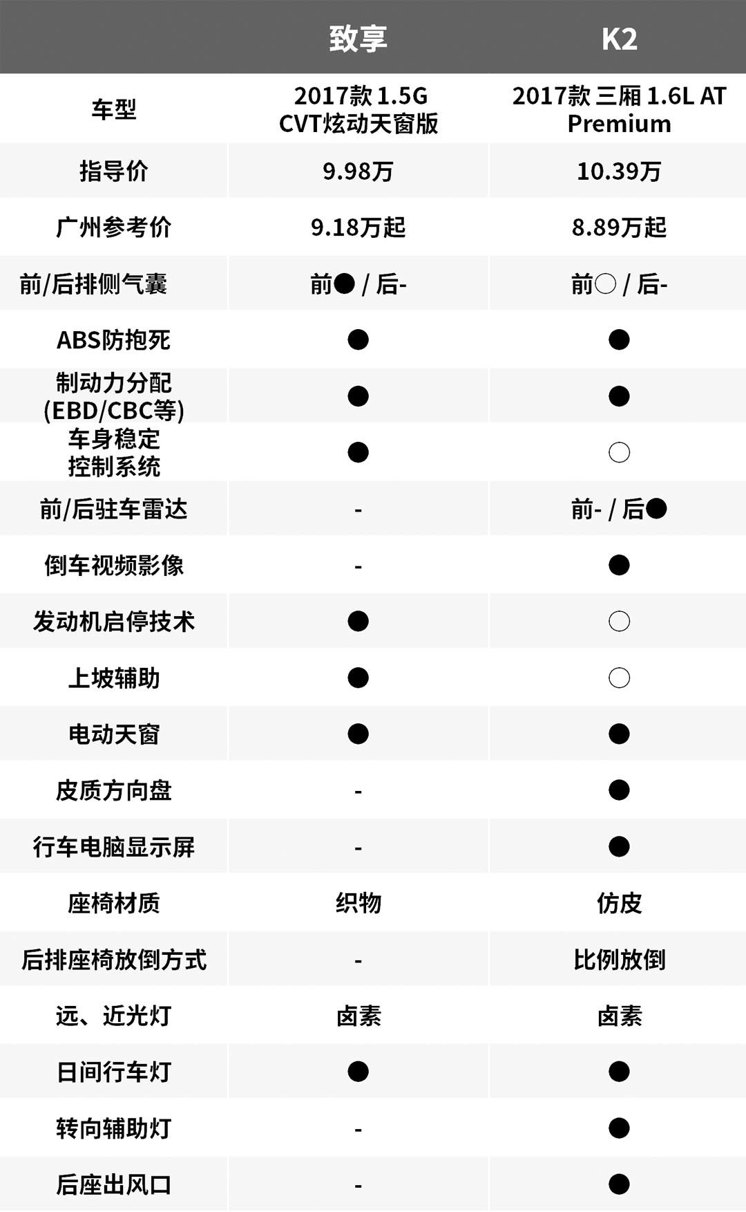 在配置上则是K2略占优势,在各种实用性配置上K2还是比较齐全的,不过到了顶配车型ESP还只是选配,这个就太不应该了。致享的配置优势在于安全配置全系标配,但是其它配置就跟K2不是一个级别的了,不仅没有后座出风口,连后驻车雷达都没有,配置还是比较简陋的。