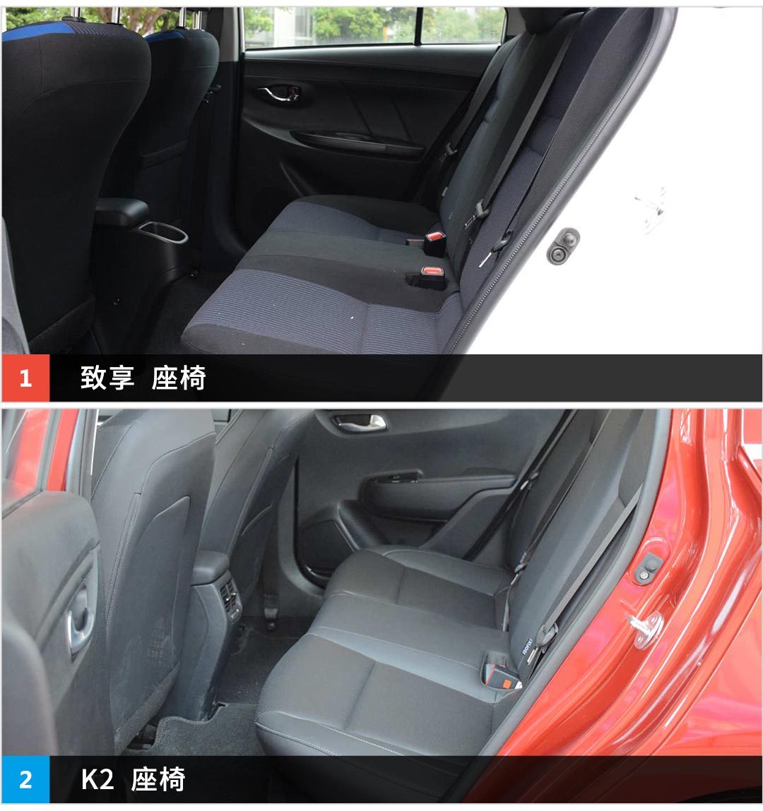 两车的座椅都比较平坦,致享带有后排中央头枕,对中间乘客更加友好,K2则没有。在座椅材质上致享采用的织物座椅在视觉效果和舒适度上都不如采用皮质座椅的K2,但总的来说还是致享的后排设计更加照顾乘客一些。