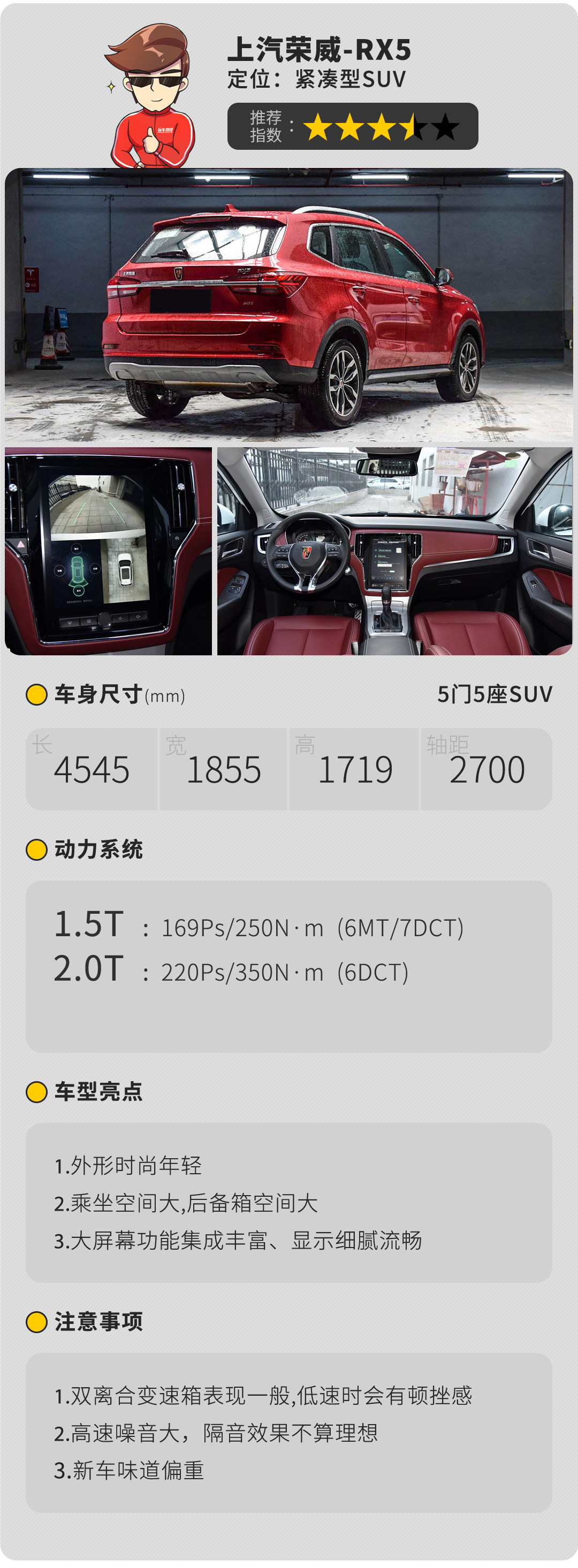 内饰采用标准的T字型布局设计,设计感一般,但做工用料继承了上汽精细水准;在高配置车型上的中控显示屏为10.4英寸,显示效果细腻,而且搭载的互联系统是此车的一大亮点之一;发动机低扭的表现都不错,整体输出较为平顺,能让人满意,底盘有着不错的舒适性,但是双离合变速箱在低速换挡时会存在一些顿挫感。