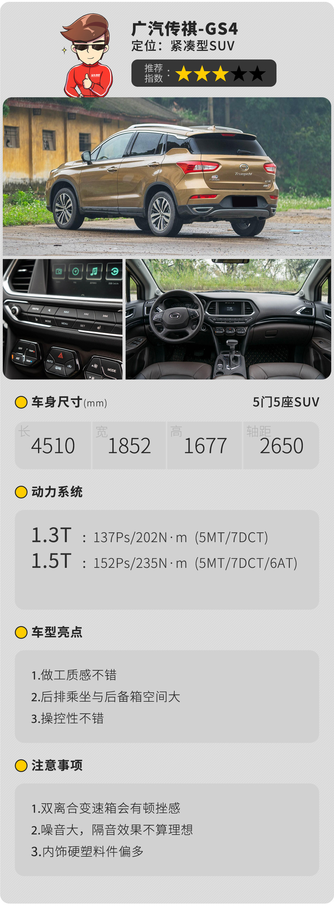内饰营造的层次感不错,各个功能布局清晰,做工水准也很高,不过在用料上还需加把劲;底盘表现有着不错的功底,路感清晰之余,振动也抑制得不错,对路面细小的颠簸处理还算得体,有着让人满意的舒适性。
