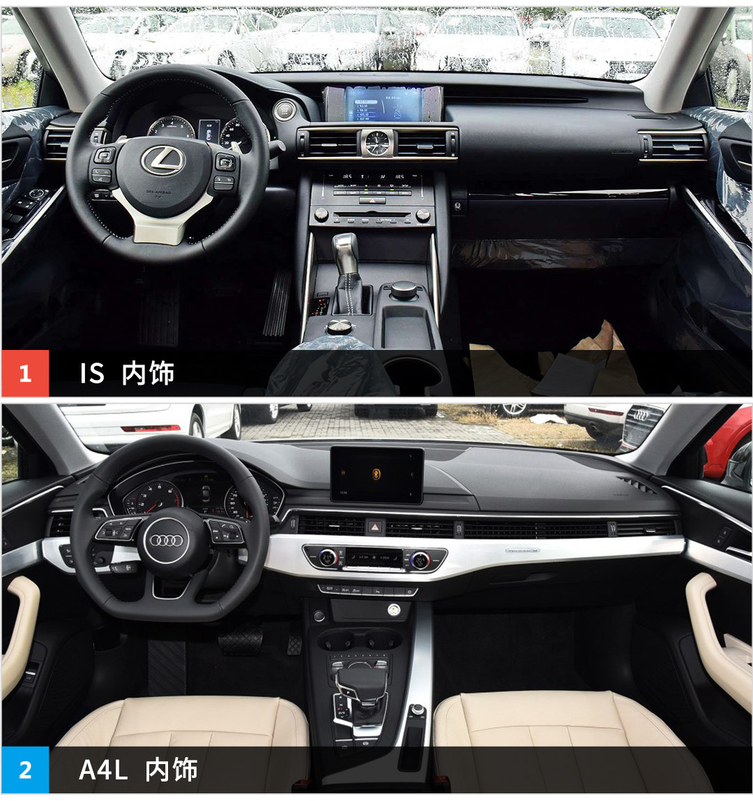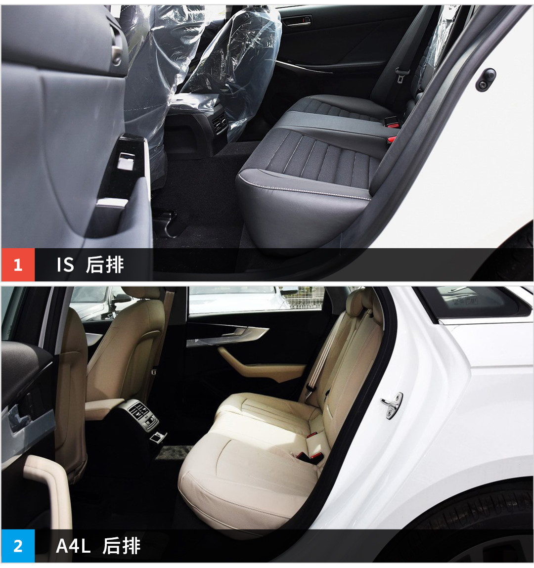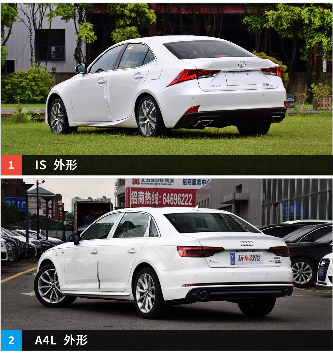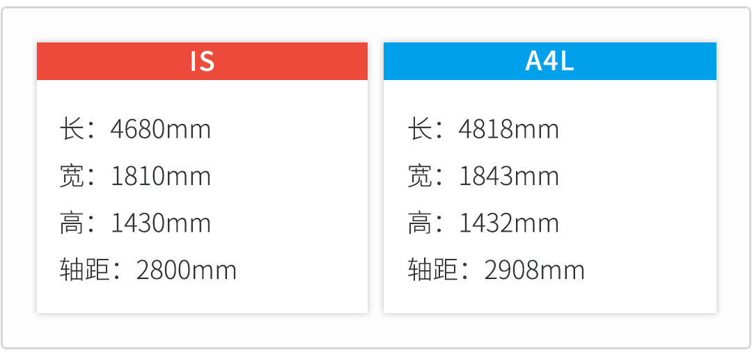 看完外观看下两部车的车身尺寸,两部车这样看起来有种就根本不是同一级别的感觉,A4L无论长、宽、高还是轴距都完爆IS,当然也让A4L更有种行政车的味道。