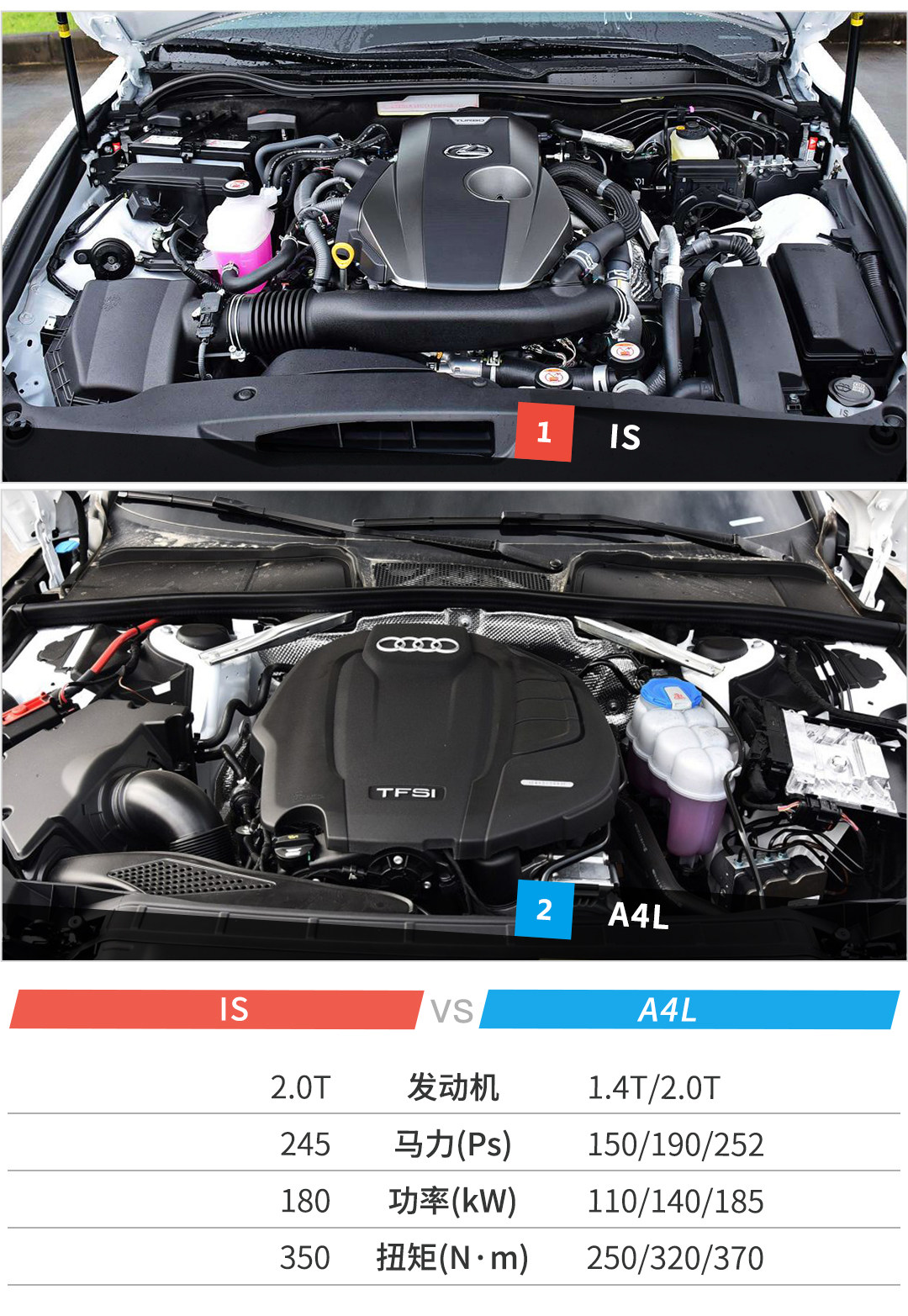 在动力上IS全系都是采用2.0T发动机搭配8AT变速箱,这套也是目前在丰田车上主流得不能再主流得一张牌了。而A4L则有1.4T和2.0T两种选择,搭配7速双离合变速箱,2.0T还分为低功率于高功率两个版本。别看IS这套动力总成就以为好欺负,实际藏了不少“暗器”,搭配了更多的技术,最简单的例如混合喷射和VVT-iW。搭载第三代EA888的A4L也不是吃素的,技术上自然紧跟潮流,很难让人找到吐槽点。