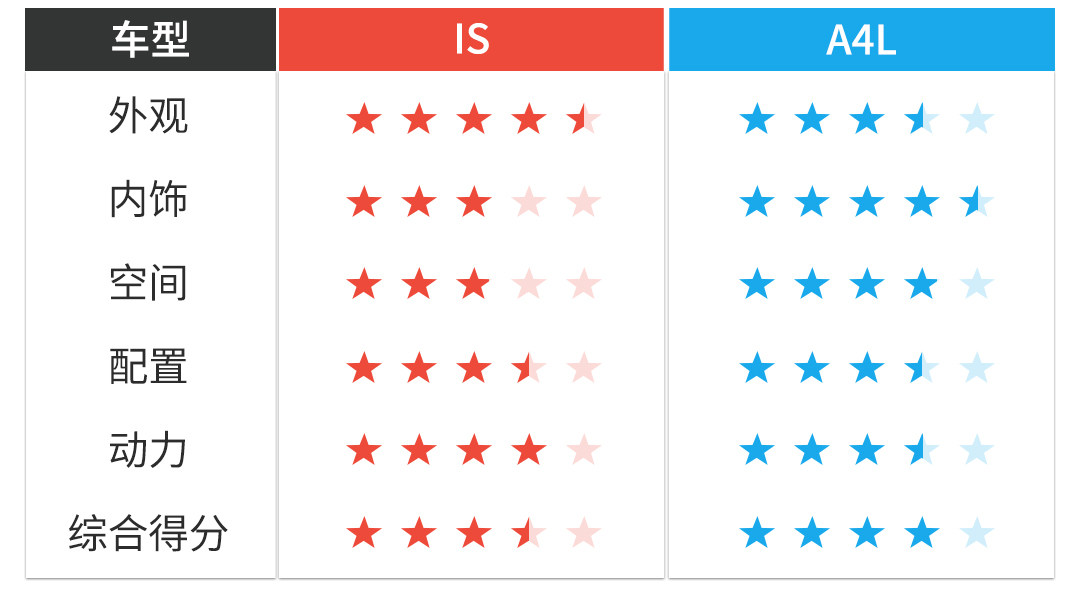 经过这几轮的对比之后相信大家也能看的出关于这两部车的不少性格,IS无论是从哪里都透出露自己是唯一纯正日本血统的绅士,外形喜欢的人对它死心塌地,讨厌的则无论它怎么改变都觉得难接受,内饰保持着日本人一成不变的保守,也就是“无聊”,这点严重影响了它的吸引力,但是,这可能才是IS或者雷克萨斯的魅力,一位外冷内热的日本帅哥。以前的A4L怎么样看上去都有种想是一个穿着一套合适西装的科技宅小男孩,而换代之后的A4L给人就是一种这小男孩长大之后的样子,外形没怎么变,但内里学会了怎样用自己的技术包装自己,空间则是像个小暖男那样会去迎合你的喜好,当你买下A4L的那瞬间,就会在心里想到那句爱情电影里经常出现的对白,“终于等到你了”。