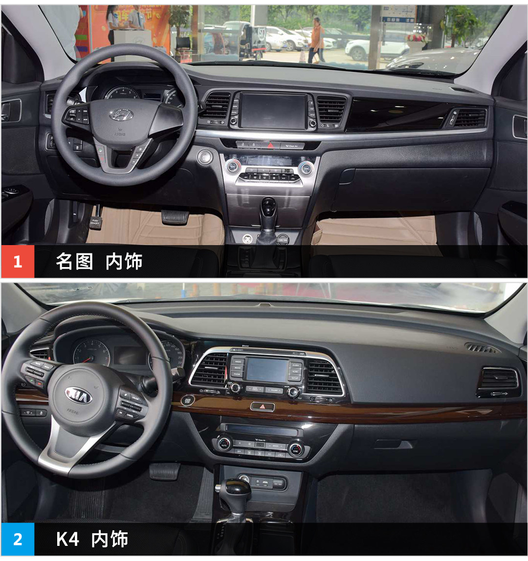 来到内饰,K4显得比较成熟稳重,加上木纹营造出豪华感,名图则是显得大气,对称有序,两车各有各的优点。