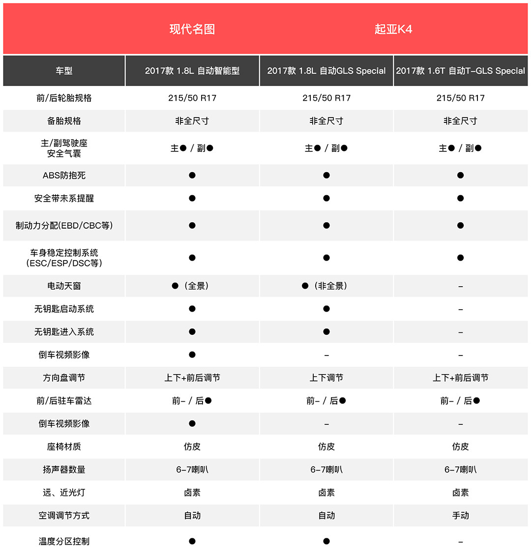 然后是这两款车的配置,基本都差不多,但是在14.98万的价位上,K4无论是1.6T还是1.8L的配置却不如名图的丰富,而名图在这个价位却没有1.6T的动力总成,这也算是各有胜负吧。