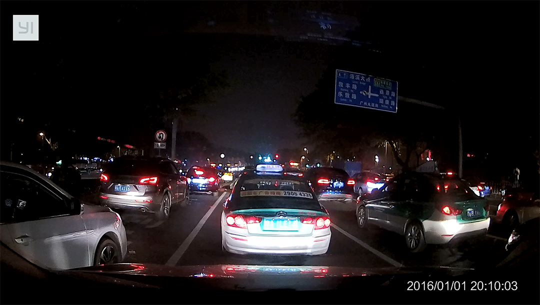 到了晚上,昏暗的光线对于大多数记录仪来说可能就不那么友好了,夜晚的效果判断和白天相同,清晰度依然是最重要的指标,记得要看得清楚车牌。而且夜晚对向车道的车灯照射到摄像头之后也会对成像效果有些影响,这时候记录仪的测光表现则非常重要了。比如说这个小蚁记录仪在夜晚时车牌的清晰度就差了很多了,前面的TAXI的车牌在近光灯照射后甚至都看不清楚。