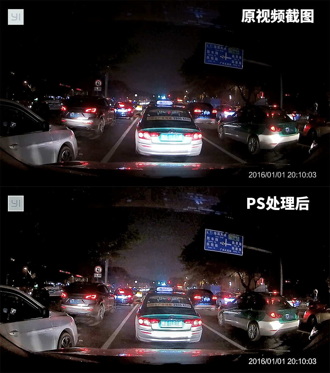 上图为夜景样张,原图和处理后的样张图差异比较大,经过PS处理后的图不仅路牌更加清晰,画面更加锐利,暗部细节更清楚,而且原本过曝的出租车车牌也变得清晰易见,因此不要相信购物网站的商家演示图,切记购买7天无理由退换的记录仪产品为好。