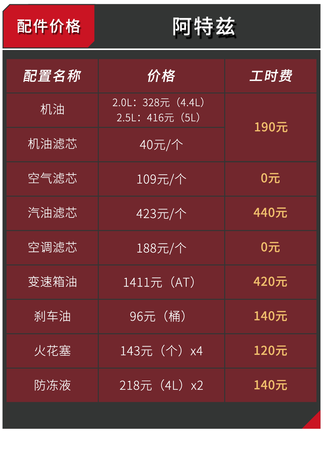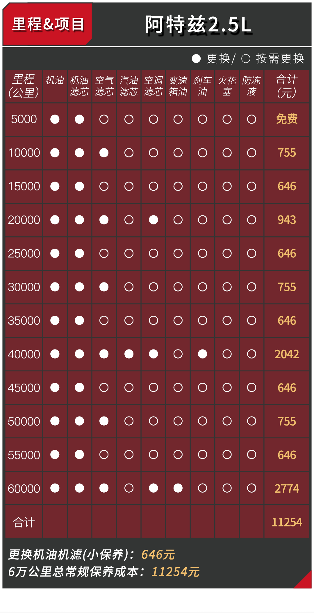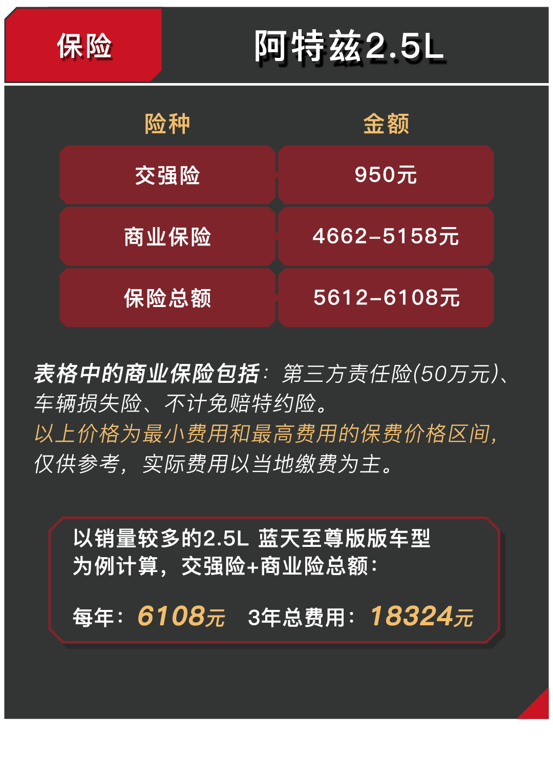 可以看到2.0L阿特兹的总体费用确实要比1.5T君威还贵上一点点,但主要是保险费用更高,而保养和油费实际上都要低于1.5T君威。2.5L阿特兹在各方面的费用都要低于2.0T君威,同时也没有2.0T君威那么“挑食”,加92号汽油即可。