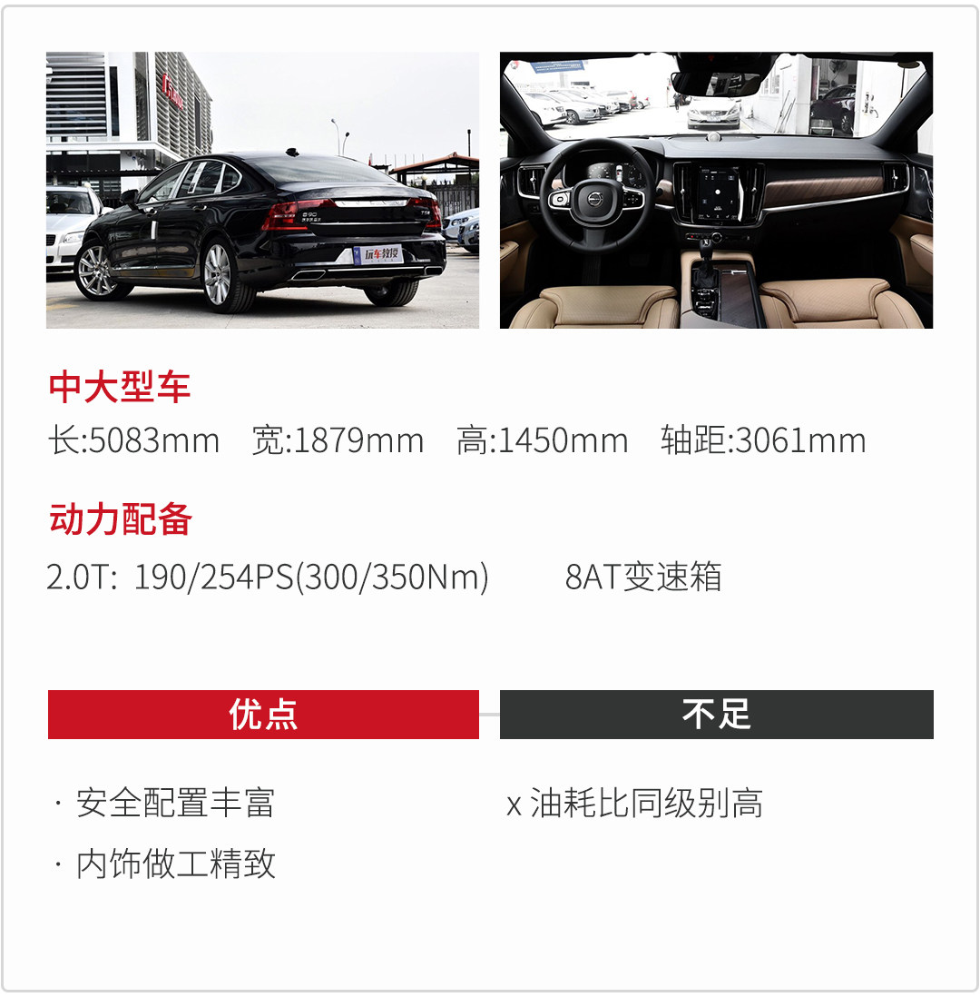 S90采用了较为简洁的设计风格,内凹式进气格栅以及雷神之锤LED大灯不仅提高辨识度,对于品牌形象也有很大的帮助。“大锤”型LED大灯、全景天窗、自适应远近灯调节和自动泊车为全系标配,前后雷达+倒车影像也是全系标配。S90只提供一款2.0T发动机可选择,根据不同配置分为低功率版和高功率版,最大区别为两者最大功率为190匹马力和254匹马力。最高配的两款车还能选装空气避震。
