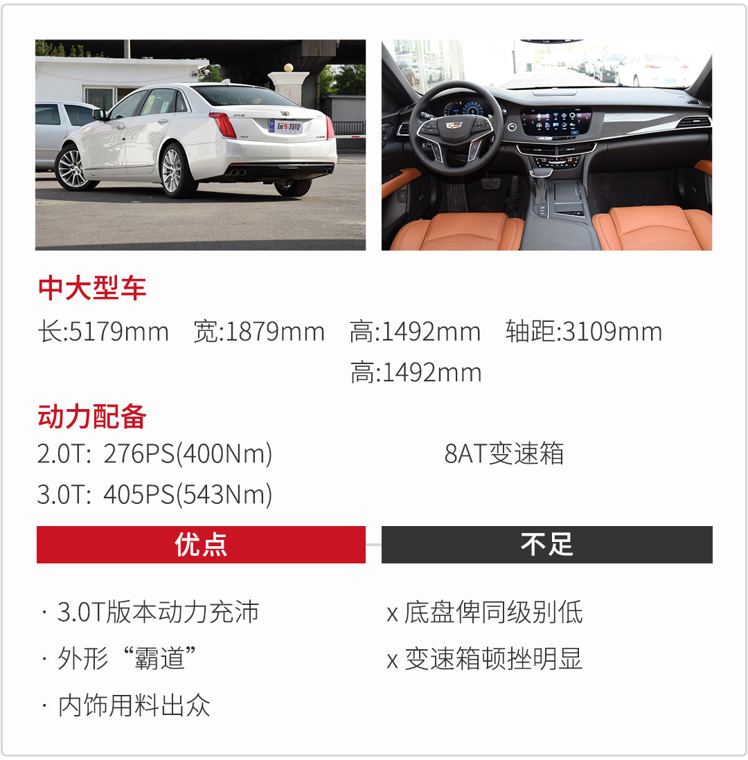 在中大型车里CT6有着老大哥的“资格”,“旗舰”这两个字用来描述CT6真的再适合不过,尺寸上比宝马5系长轴距版整整大了一圈。CT6在造型上也是十分独特的,钻石切割设计使得它看起来气场十足,再契合庞大的身躯,回头率不比BBA们低。在内饰豪华的营造上,CT6绝不逊色于任何一位竞争对手。中控台由大面积皮革包覆,细节上还点缀了几处木纹装饰,看着就能帮车主长不少面子。传动动力上分为2.0T和3.0T两台发动机,其中3.0T是一台V6发动机搭配双涡轮,而且是四轮驱动,2.0T版本最大功率和峰值扭矩为276匹马力和400牛·米,数据表现属于同级别中的领先水平。
