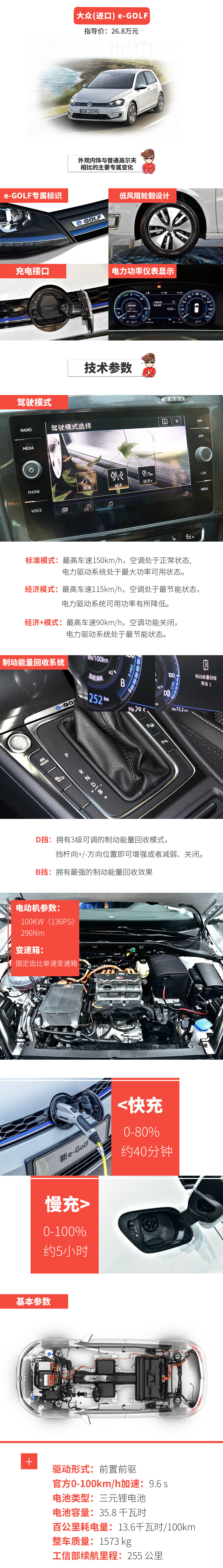 e-Golf是一款整体表现均衡度不错的纯电动产品,继承了普通版高尔夫轻松好开的驾驶风格,不过其255公里的续航里程也划定了可走圈子不大,这也是稍显遗憾的一点;