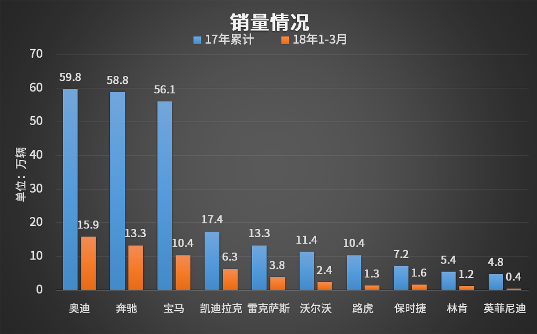 (注:宝马品牌销量数据不包含MINI品牌,奔驰品牌销量数据中不包含smart品牌。同时为了保证公平,路虎品牌与捷豹品牌销量进行了拆分。)