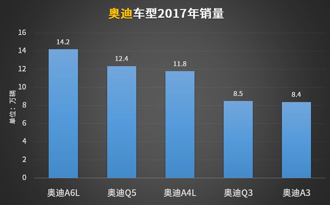 我们可以看见比五环少一环的奥迪,不愧是中国豪华品牌市场销量的龙头老大哥,多年来对于中国消费者的消费心理揣摩得到位,多款国产车型的表现强势,它的主销车型的占比如下: