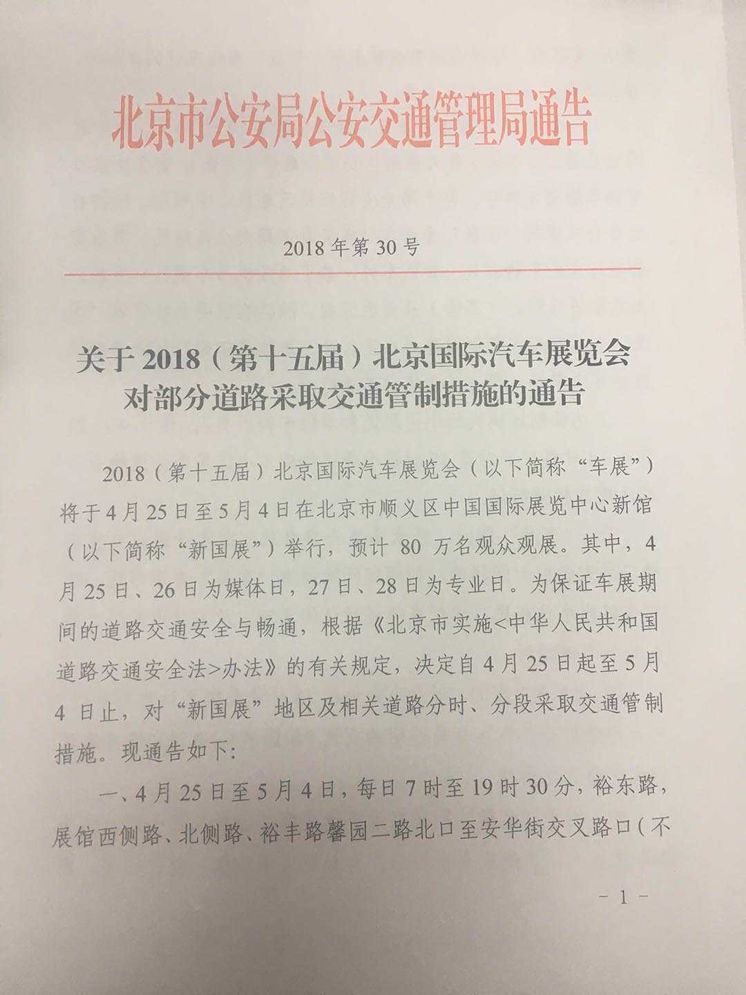 2018(第十五届)北京国际汽车展览会(以下简称“车展”)将于4月25日至5月4日在北京市顺义区中国国际展览中心新馆(以下简称“新国展”)举行,预计80万名观众观展。其中,4月25日、26日为媒体日,27日,28日为专业日。为保证车展期间的道路交通安全与畅通,根据《北京市实施<中华人民共和国道路交通安全法>办法》的有关规定,决定自4月25日起至5月4日止,对“新国展”地区及相关道路分时、分段采取交通管制措施。现通告如下:
