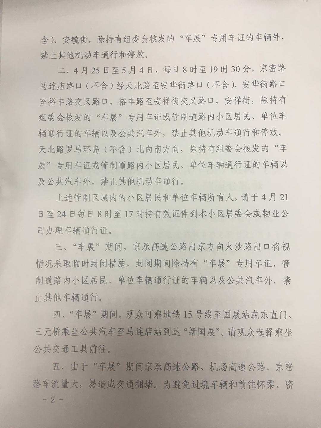 二、4月25日至5月4日,每日8时至19时30分,京密路马连店口(不含)经天北路到安华街路口(不含),安华街路口至裕丰路交叉路口,裕丰路到安祥街交叉路口,安祥街,除持有组委会核发的“车展”专用车证或管制道路内小区居民、单位车辆通行证的车辆以及公共汽车外,禁止其他机动车通行和停放。天北路罗马环岛(不含)北向南方向,除持有组委会核发的“车展”专用车证或管制道路内小区居民、单位车辆通行证的车辆以及公共汽车外,禁止其他机动车通行。