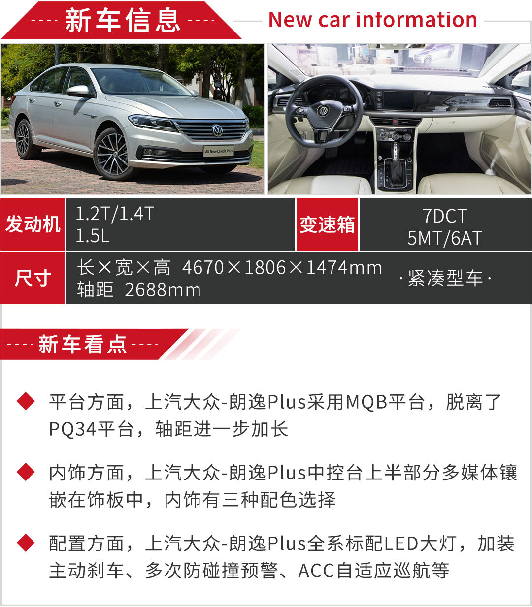 大众喜欢家族式脸谱,但是朗逸Plus的外观有新变动,车头设计像新款大众Arteon,侧面线条也变得时尚,C柱有点溜背的意思,车尾微微上翘,十分性感,大众紧凑型车终于骚起来了,拒绝沉闷的消费者可以考虑一下,并且不再使用卤素光源了,全系标配LED大灯,内饰方面,中控大屏位置进行调整,上移与仪表台同一水平线上,原设计在驾驶过程中会导致驾驶者视线大范围转移,影响驾驶安全。另外朗逸Plus还加装主动刹车、多次防碰撞预警、ACC自适应巡航等配置。上汽大众不单学习iPhone的命名,还要学习iPhone的销售手段,未来朗逸Plus将与现款同堂销售,可能与一汽大众的速腾摩擦出火花。