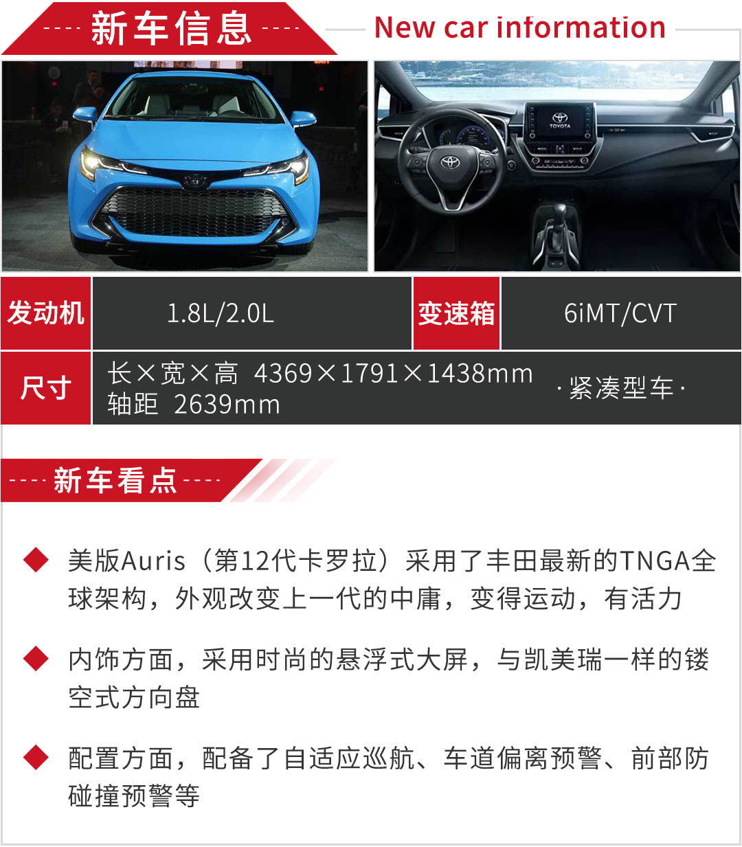 虽然国内卡罗拉3月份上市2018款,但是随着TNGA全球架构的到临,丰田各车型都开始发生变动,凯美瑞上新了,奕泽也接受预定了,当然丰田也不会忘记卡罗拉。在2018的纽约车展中,丰田推出第十二代卡罗拉,新车造型不再中庸,得到信息美规只有2.0L高燃效比发动机配备6iMT智能手动变速箱和模拟10速的CVT变速箱,这两种动力总成将更加省油,符合家用车需求,同时也增添了运动风。